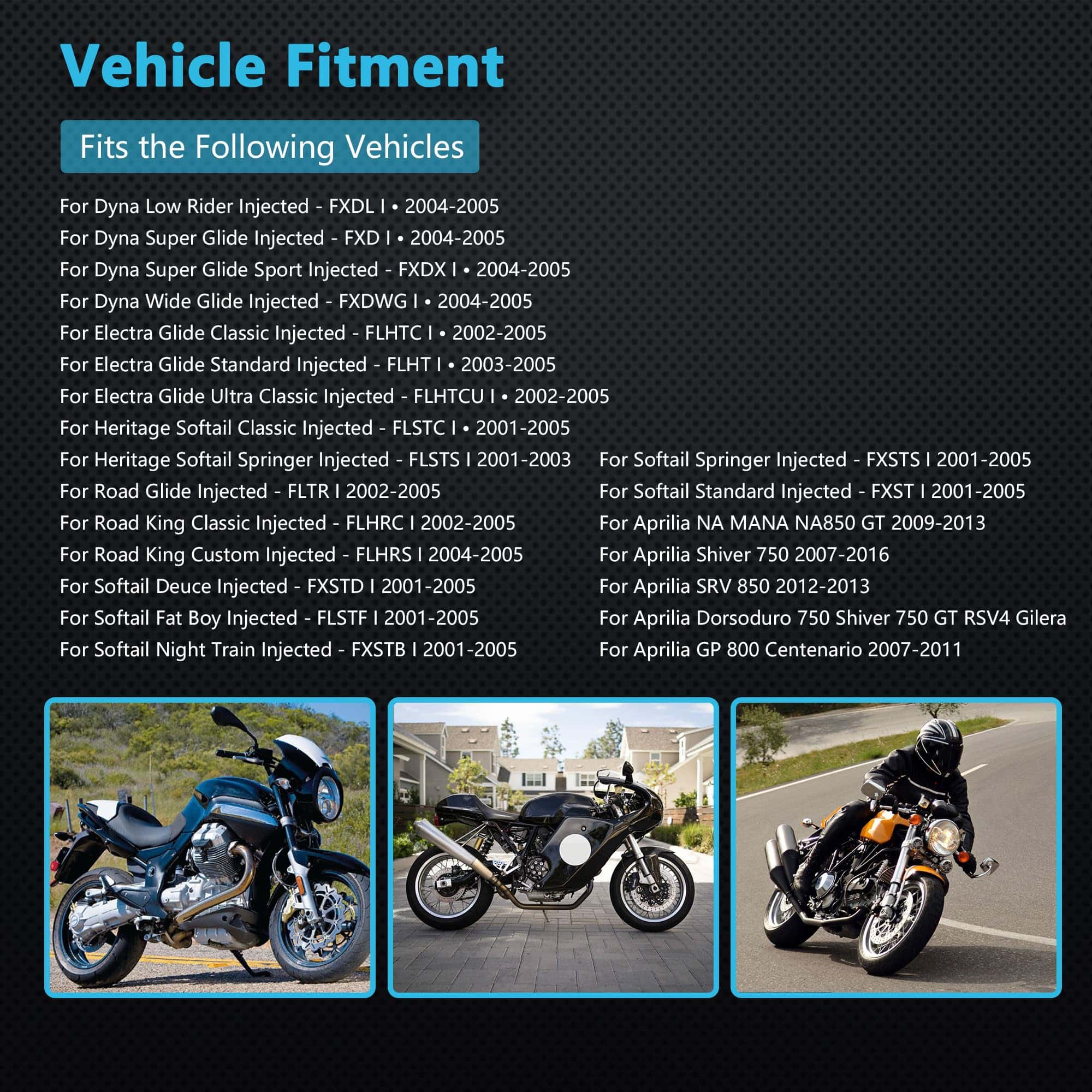 1. Compatibilidad: Inyector de Combustible Yezoauto Compatible con Harley Davidson Softail 2004-2005, Harley Davidson Dyna FLH FLT 2001-2010, Moto Breva V IE 850 2003-2009, Moto Breva 1200 V IE 1100 2003-2009, Moto Norge 850 2006-2016, Moto Norge Polizia Berlino 850 2006-2016, Moto Griso V IE 850 1100 2005-2013, Aprilia NA MANA NA850 GT 2009-2013, Aprilia Shiver 750 2007-2016, Aprilia SRV 850 2012-2013, Aprilia GP 800 Centenario 2007-2011.