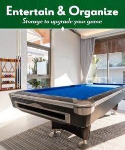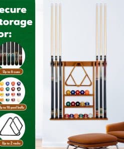 1. SOPORTE DE JUEGO COMPLETO – Este soporte de palo de billar para la pared es una forma elegante de mantener tus palos organizados y fuera del camino. Disfruta de 6 soportes para palos, 16 soportes para bolas y un gancho para tu rack de billar.