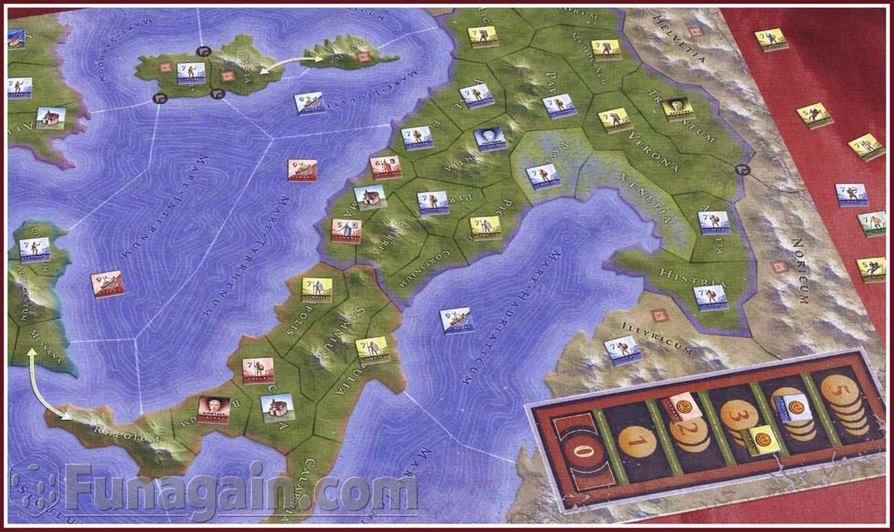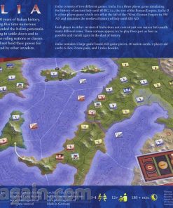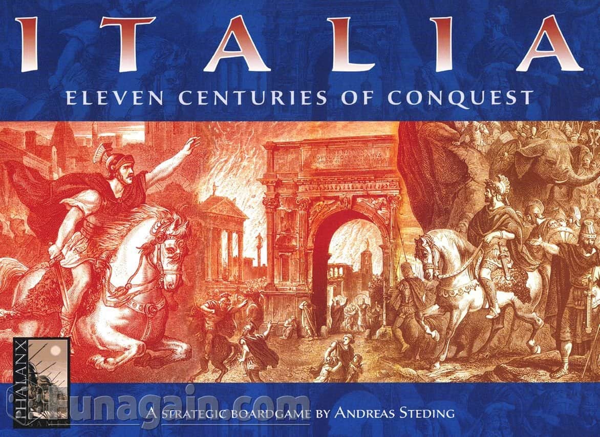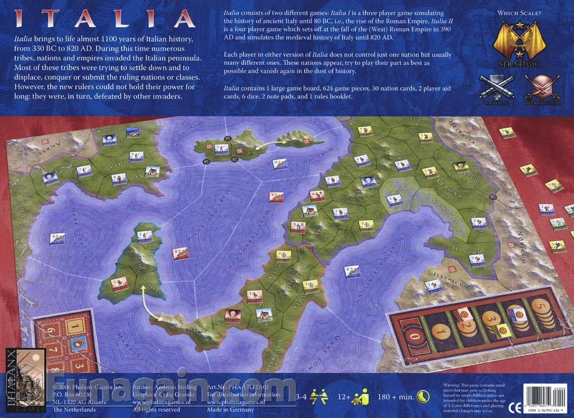 Italia nos lleva en un viaje a través de 1500 años de historia italiana, donde la península mediterránea fue invadida innumerables veces por diferentes tribus y pueblos. Italia contiene dos juegos: Italia I, un juego para 3 jugadores que se centra en la historia de la Roma clásica a.C. e Italia II, un juego para 4 jugadores que abarca la historia de Italia desde el 390 d.C. hasta el 1100. En ambos juegos, los jugadores lideran diferentes naciones y con ellas persiguen sus objetivos específicos hasta que son conquistados y generalmente desaparecen de la faz de la tierra. El contenido incluye 1 tablero de juego, 30 cartas de nación, 624 piezas de cartón de juego, 2 tarjetas de ayuda para los jugadores, 6 dados, 2 blocs de notas y 1 folleto de reglas.