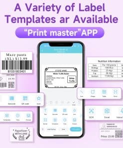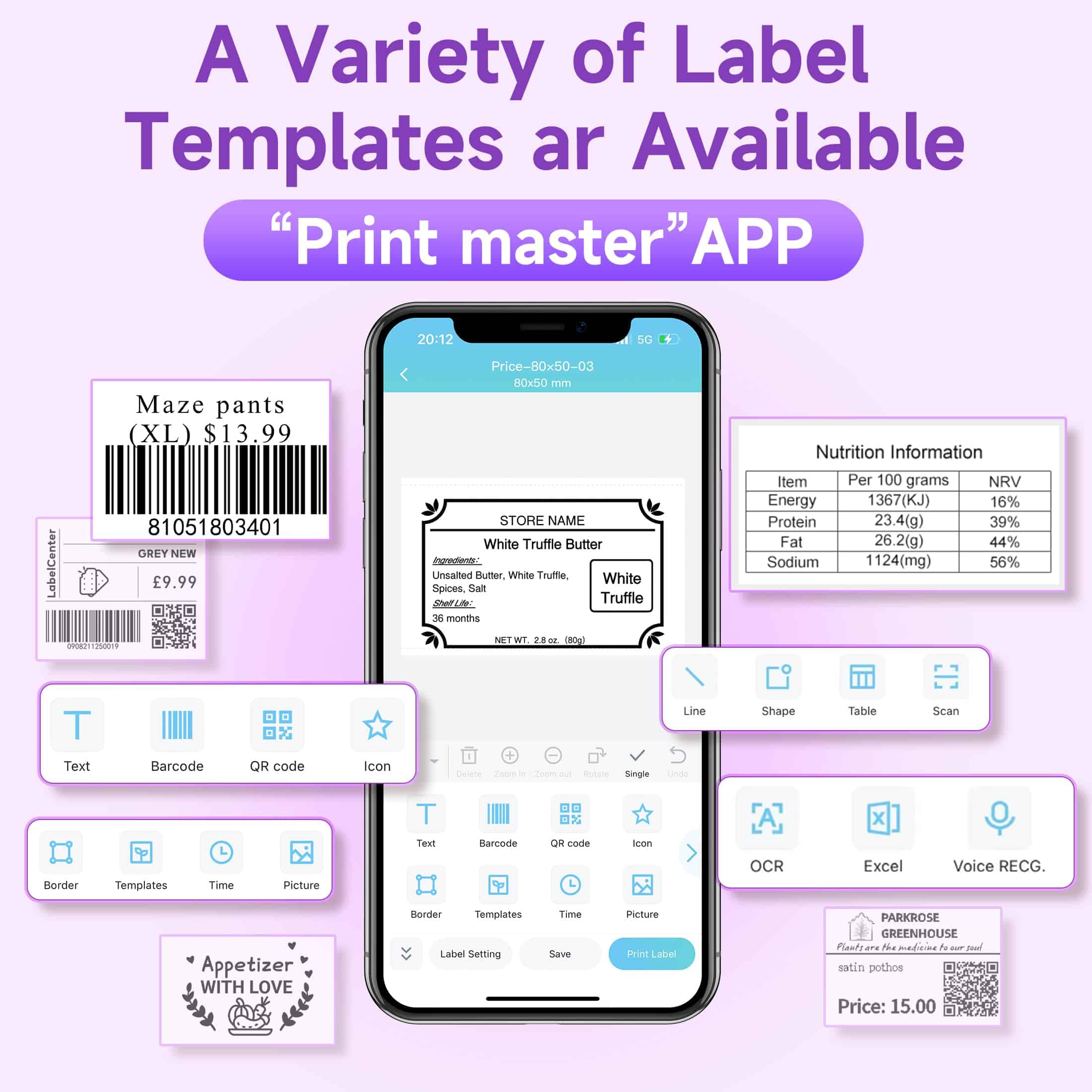 3. Múltiples Funciones y Plantillas: Todas las plantillas de la aplicación son gratuitas, múltiples materiales y plantillas para que las utilices, esta impresora de etiquetas te permite diseñar y editar etiquetas fácilmente. Escaneo con un solo botón para agregar plantillas, puedes añadir fácilmente texto, imágenes, códigos de barras, códigos QR, etc., para que tu impresión sea más flexible y conveniente.