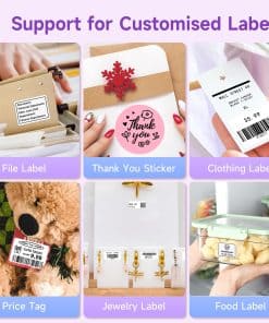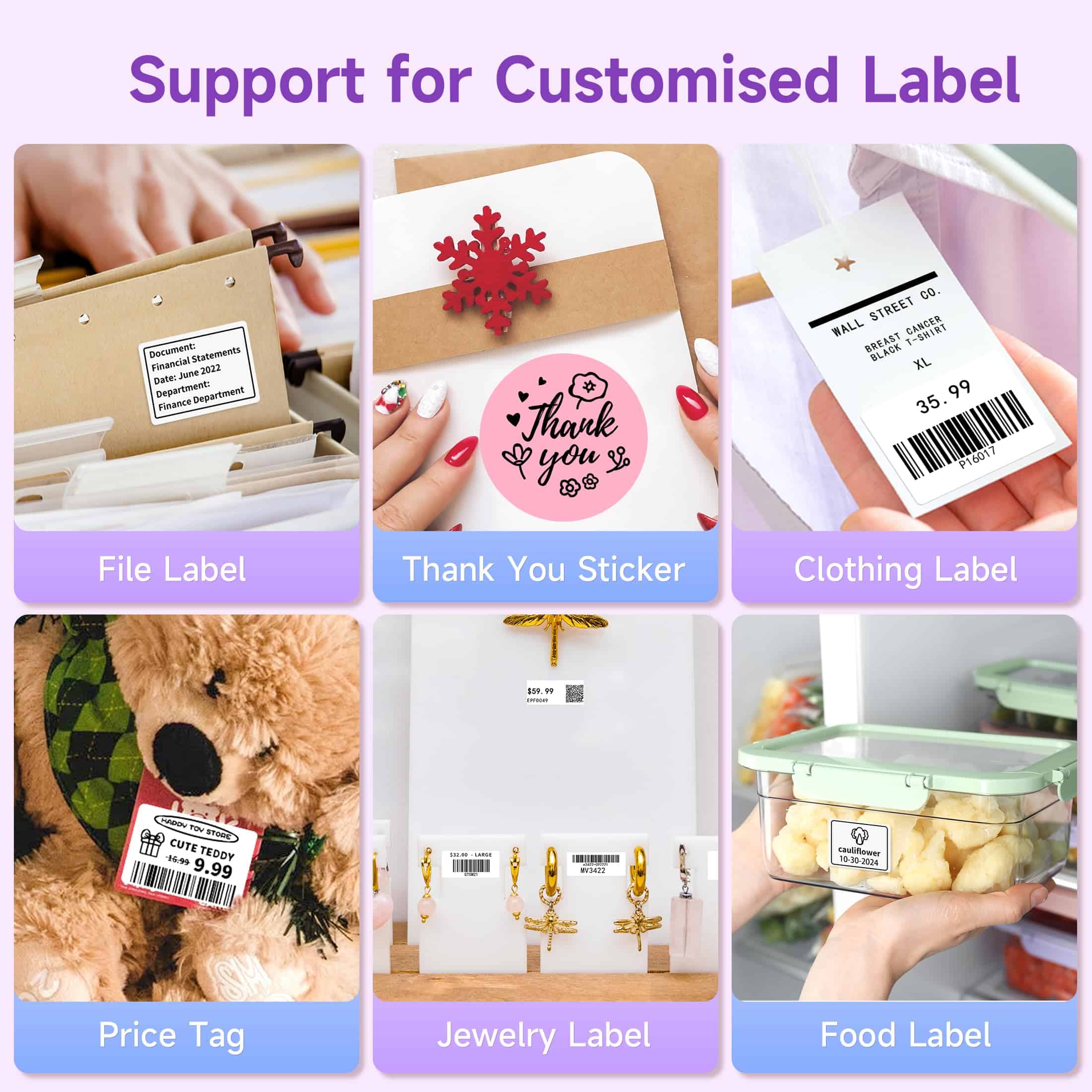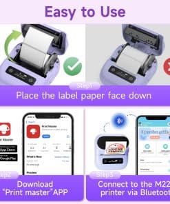 2. Impresión Multipropósito: El label maker soporta impresión de 0.78-3.14 pulgadas de ancho para una variedad de necesidades de impresión de etiquetas. La mini impresora M220 se puede utilizar en una amplia gama de aplicaciones como ropa, joyas, cables, precios, direcciones, supermercados, archivo casero, archivo de oficina y pequeñas empresas. (Nota: El Label Maker M220 solo admite impresión monocromática, es decir, solo puede imprimir texto negro.)