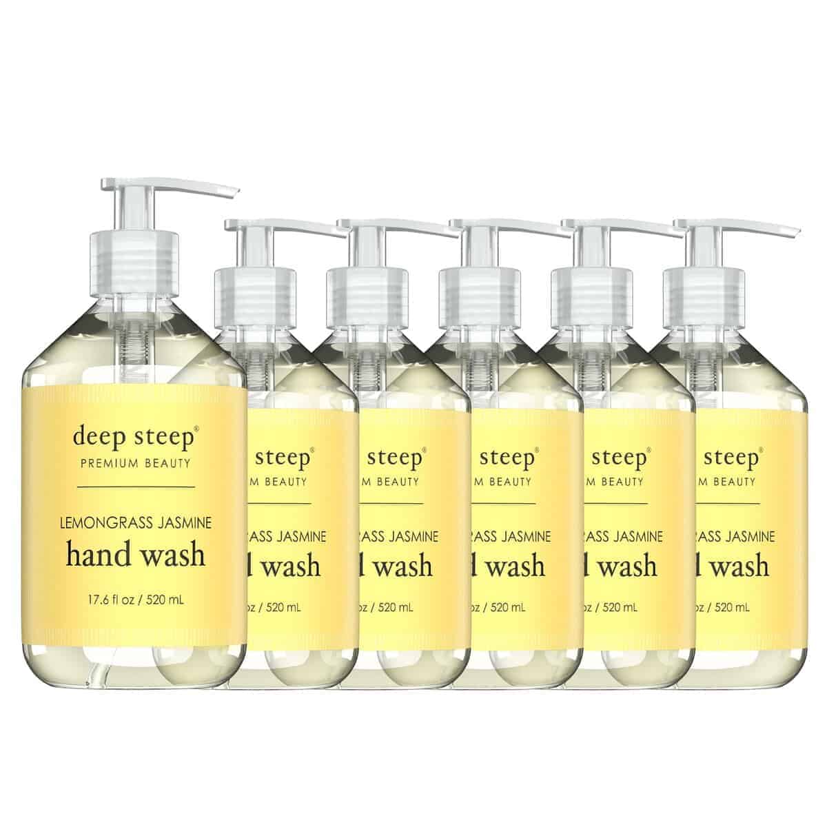 1. El Jabón de Manos Líquido Deep Steep Pack de 6 utiliza limpiadores a base de coco para limpiar eficazmente tus manos, sin quitarles la humedad. La mezcla natural de aceite de argán orgánico, aceite de coco y manteca de karité trabajan juntos para proporcionar una hidratación duradera.
