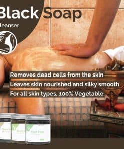 El jabón negro marroquí o jabón beldi es un jabón 100% natural altamente alcalino, que apareció hace más de 3000 años, y está elaborado a partir de aceite de oliva y aceitunas maceradas. Tiene una consistencia de gel/pasta. Se utiliza para eliminar toxinas del cuerpo y preparar la piel para la exfoliación. En hammams marroquíes, el jabón negro se utiliza para limpiar, humectar y exfoliar la piel muerta. Dado que el jabón negro es orgánico y no contiene químicos para hacerlo duradero, si dejas tu bote de jabón negro en la ducha o en un ambiente cálido, puede convertirse en líquido. No te preocupes, puedes usarlo como cualquier gel de ducha líquido.