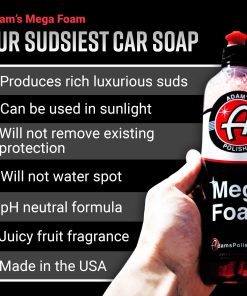 Adam’s Mega Foam Car Wash Soap es un jabón altamente concentrado diseñado para proporcionar la máxima cantidad de espuma necesaria para limpiar tu vehículo sin arriesgarse a rayarlo. Este jabón crea una abundante espuma espesa y lubricante que permite eliminar de manera segura la suciedad, el polen, el hollín y otros contaminantes sin dañar las superficies de tu vehículo. Su fórmula de pH neutro no elimina la cera, selladores ni seca piezas de plástico y hule, protegiendo las capas existentes de protección. Una vez enjuagado, deja un brillo impecable sin dejar rastros. Fabricado en USA, este jabón de alta calidad es la opción ideal para mantener tu vehículo en condiciones impecables. ¡Con la garantía de satisfacción del 110% de Adam’s, puedes confiar en que recibirás un producto de la más alta calidad!