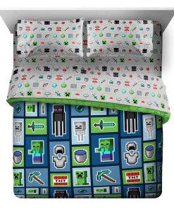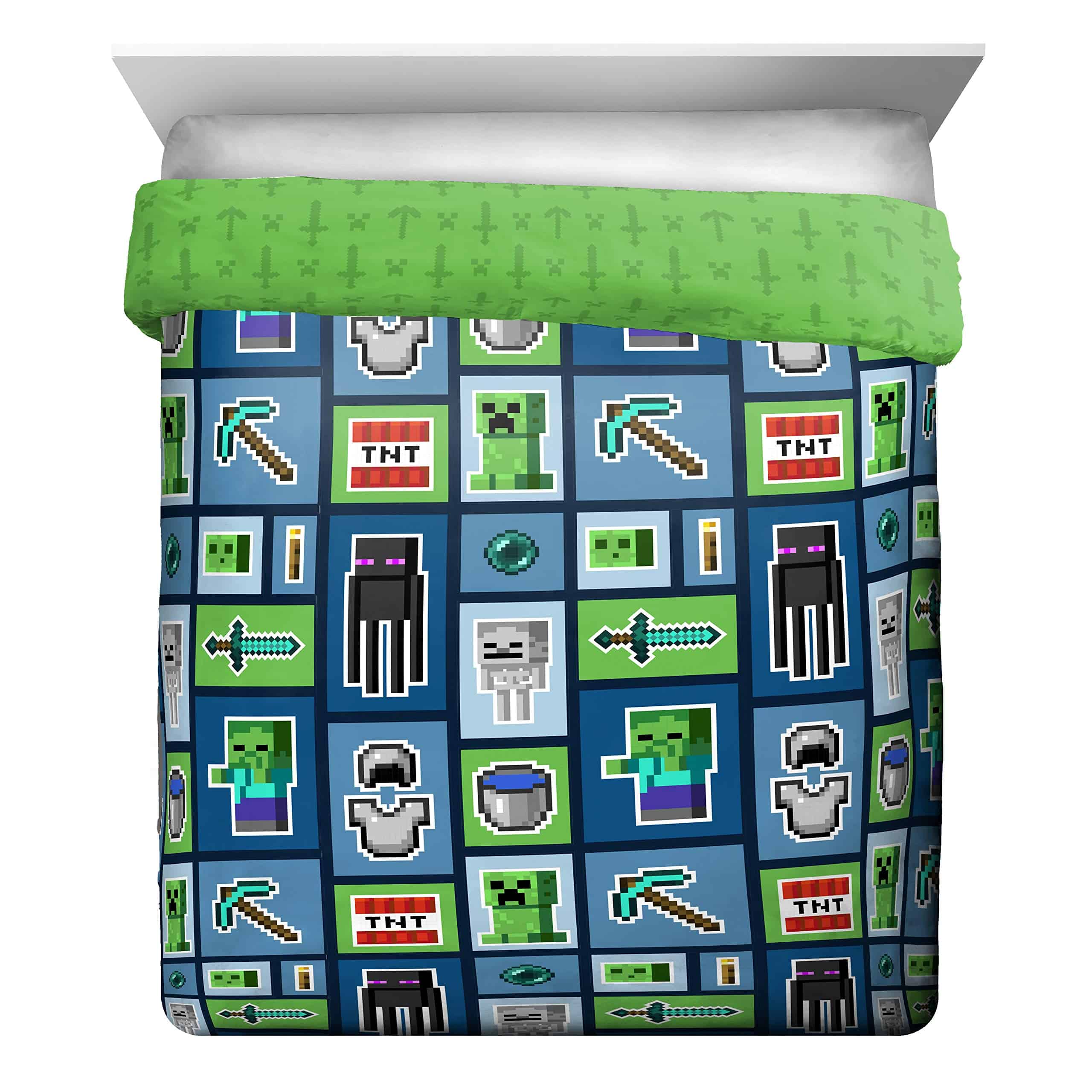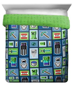 1. AJUSTE PERFECTO Y DISEÑO DIVERTIDO – Este juego de cama queen de Minecraft incluye (1) edredón queen de 90 x 90 pulgadas, (1) sábana ajustable de 60 x 80 pulgadas, (1) sábana plana de 90 x 102 pulgadas, y (2) fundas de almohada estándar de 20 x 30 pulgadas. Añade un toque de encanto decorativo a tu habitación con nuestro elegante y súper suave juego de cama de Minecraft. 2. ALTA CALIDAD Y GRAN VALOR – ¡Mantén a tu pequeño/a tan acogedor/a como puede ser! El juego de cama queen de Minecraft es súper suave y perfecto para todas las estaciones. El poliéster de microfibra cepillada al 100% permite un sueño confortable. Resistente a las manchas y lavable a máquina. Para limpiar, lavar a máquina en frío. Para secar, secar al aire/o en secadora a baja temperatura. 3. GRAN REGALO – Este juego de cama queen de Minecraft hará sonreír a cualquier niño/a y transformará cualquier habitación, habitación de invitados, habitación infantil, RV o casa de vacaciones. Gran regalo para la escuela o el hogar. Se enrolla para un fácil almacenamiento y viaje. El diseño divertido y colorido presenta a tus personajes favoritos de tu hijo/a Creeper, Enderman, Zombie y Esqueleto. 4. COMPLETA LA COLECCIÓN DE MINECRAFT – Completa tu dormitorio con nuestros otros productos de Minecraft – Disponibles productos de ropa de cama y accesorios coordinados (se venden por separado). 5. NUESTRA EMPRESA FAMILIAR – Nuestra empresa sigue siendo pequeña y familiar. Nos enorgullecemos de nuestros productos y de nuestro impecable servicio al cliente. ¡Sabemos que nuestros maravillosos clientes son la razón por la que estamos en el negocio! Ofrecemos productos de excelente calidad, no tóxicos. Con nuestros accesorios de Minecraft coordinados, puedes combinar nuestros juegos de edredones para niños de alta calidad y únicos, juegos de edredones para niñas, juegos de sábanas para niños o almohadas para niños.