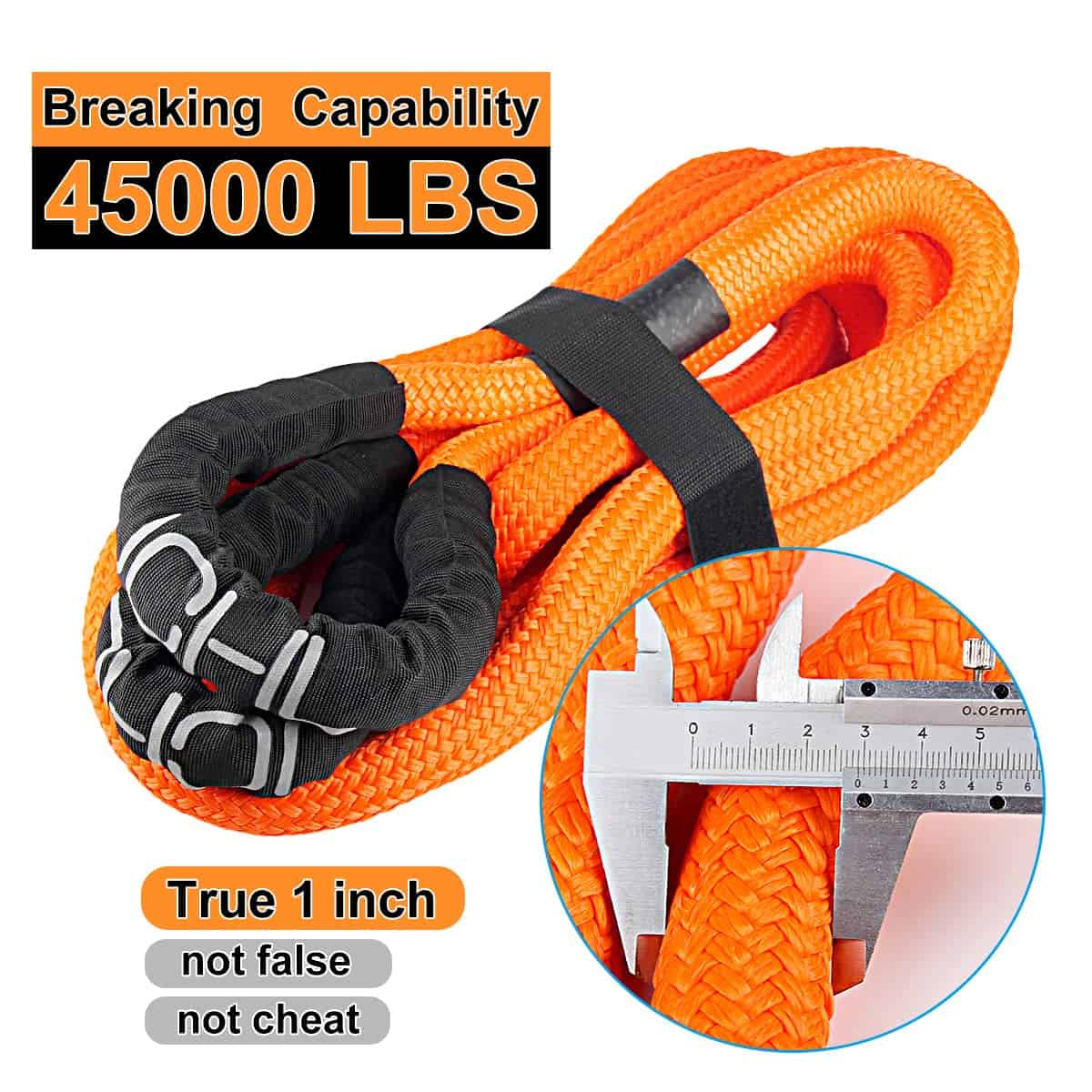 tow the rope slowly, do not tow it suddenly Product Specification: Color: Orange Maximum Length: 20feet ; Diameter:1 inch; Breaking Load: 45,000lbs Material:Made of 100% Nylon High tenacity filament 1inx20ft long heavy duty tow Strap rope, Made of Nylon High tenacity filament, 45,000 LBS Capacity. We do random testing on every production run to make sure our straps meet our expectations. Tough and durable for different uses on the trail, at work or in your yard. This recovery rope designed with durable and reinforced loops ,Which are highly resistant to wear, tear, and abrasion damage.Easy to recover your vehicles that are in tough situations such as snow, water, mud or sand. Because you never know when you might be in a tricky situation. Find your peace of mind again every time you travel.The looped ends are extra padded so as to take tension at the connection points and facilitate vehicle towing without damaging any of its parts.