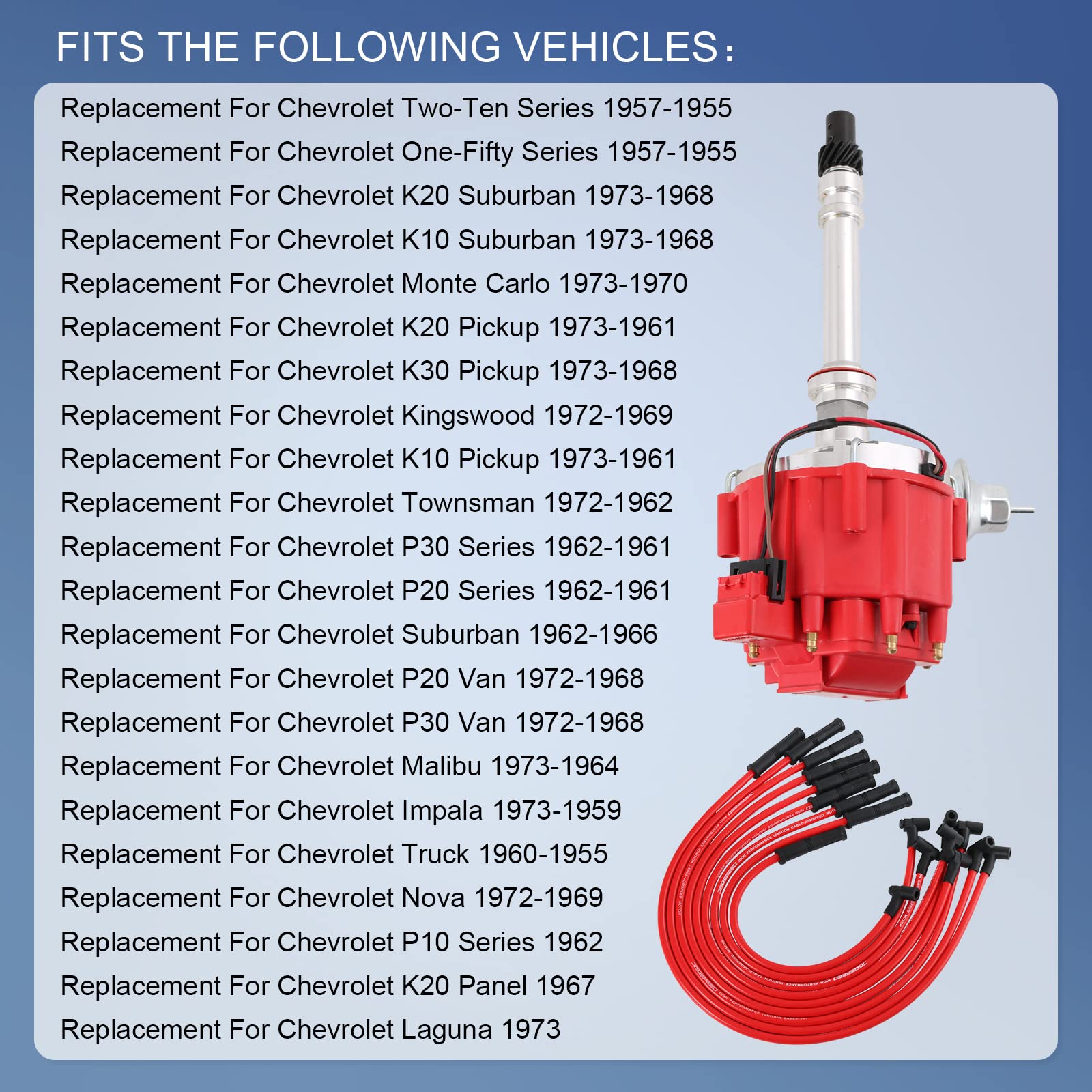 Incluye: Un distribuidor y un juego de cables de bujía. Características del producto: Fabricante: JDMSPEED Electronics Modelo: Serie de Carreras Condición: Nuevo en Caja Diseño enrollado en espiral de 10.5 mm – Núcleo KEVLAR – Supresión de RFI – Botas de Silicona de Alta Resistencia/Temperatura Ultra Alta Botas y Funda RESISTENCIA: 1.8 K ohms por metro – Estilo de bota: Bobina en ángulo de 90 grados / Motor recto. Repuesto para Chevrolet Bel Air 1973-1955 Repuesto para Chevrolet Biscayne 1972-1958 Repuesto para Chevrolet Blazer 1973-1969 Repuesto para Chevrolet Brookwood 1972-1958 Repuesto para Chevrolet C10 Pick-up 1973-1961 Repuesto para Chevrolet C10 Suburban 1973-1968 Repuesto para Chevrolet C20 Pick-up 1973-1961 Repuesto para Chevrolet C20 Suburban 1973-1968 Repuesto para Chevrolet C30 Pick-up 1973-1961 Repuesto para Chevrolet Camaro 1973-1967 Repuesto para Chevrolet Caprice 1973-1966 Repuesto para Chevrolet Chevelle 1973-1964 Repuesto para Chevrolet Chevy II 1968-1962 Repuesto para Chevrolet Corvette 1973-1955 Repuesto para Chevrolet Del Ray 1958 Repuesto para Chevrolet El Camino 1973-1959 Repuesto para Chevrolet G10 Van 1973-1968 Repuesto para Chevrolet G20 Van 1973-1968 Repuesto para Chevrolet G30 Van 1973-1970 Repuesto para Chevrolet Impala 1973-1959 Repuesto para Chevrolet K10 Pick-up 1973-1961 Repuesto para Chevrolet K10 Suburban 1973-1968 Repuesto para Chevrolet K20 Panel 1967 Repuesto para Chevrolet K20 Pick-up 1973-1961 Repuesto para Chevrolet K20 Suburban 1973-1968 Repuesto para Chevrolet K30 Pick-up 1973-1968 Repuesto para Chevrolet Kingswood 1972-1969 Repuesto para Chevrolet Laguna 1973 Repuesto para Chevrolet Malibu 1973-1964 Repuesto para Chevrolet Monte Carlo 1973-1970 Repuesto para Chevrolet Nova 1972-1969 Repuesto para Chevrolet One-Fifty Series 1957-1955 Repuesto para Chevrolet P10 Series 1962