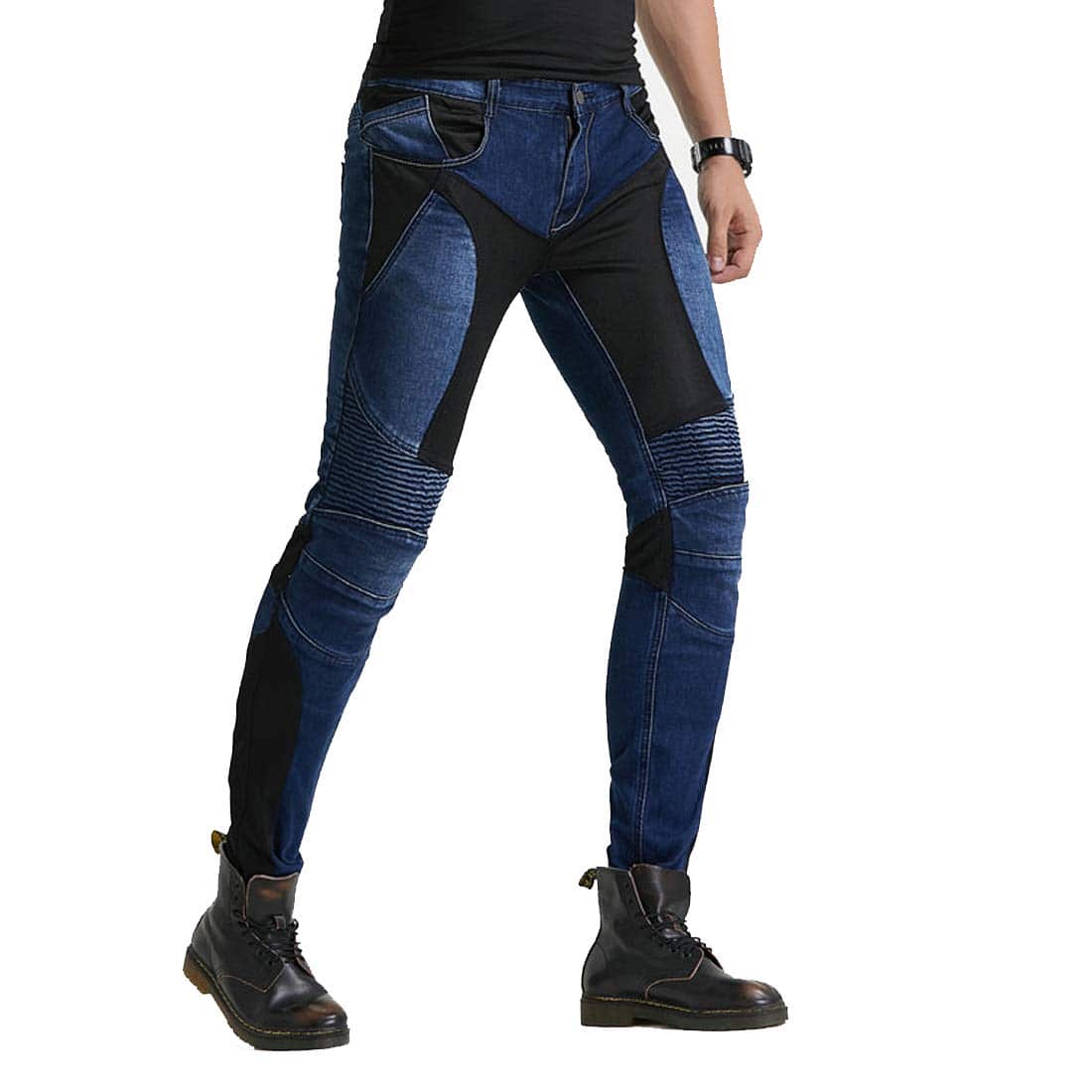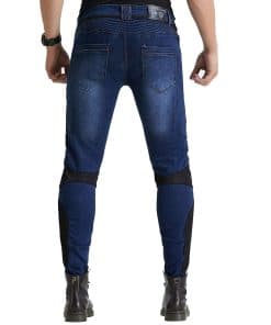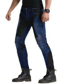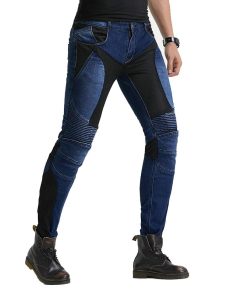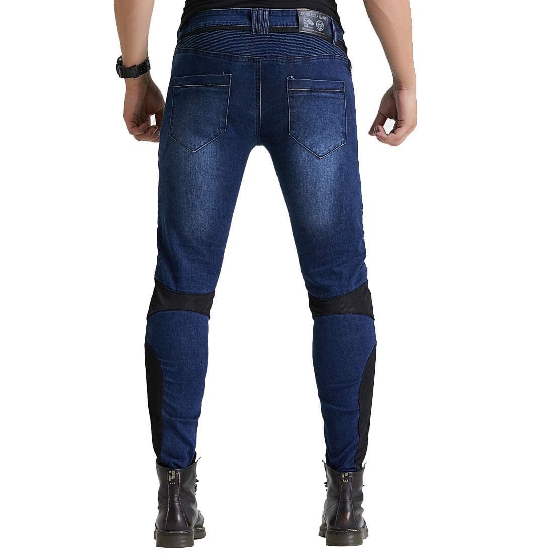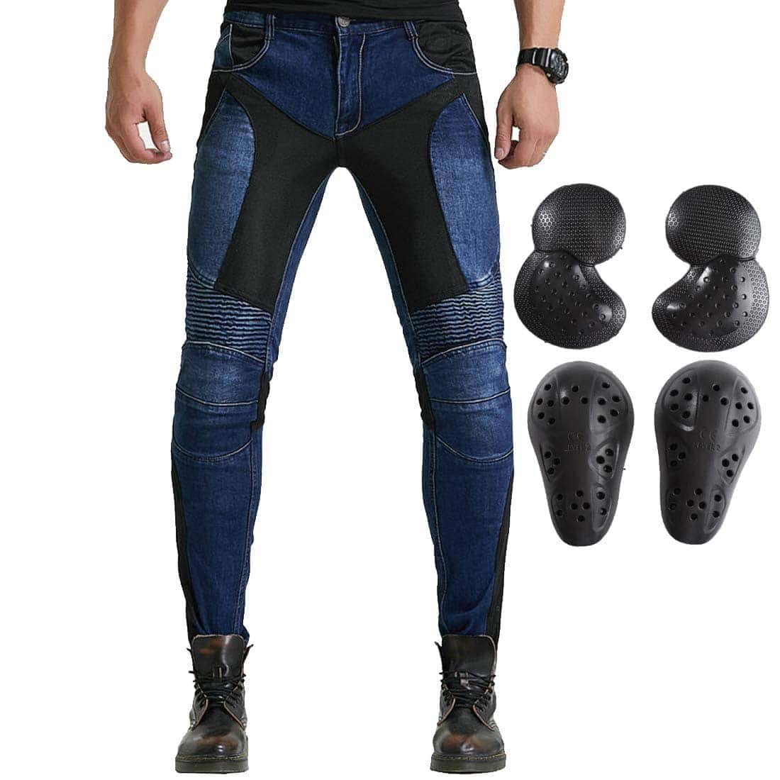 Material: 14 oz Stretch Denim Cloth, 97% Algodón, 3% Spandex. Color: Azul. Tallas: S 28, M 30, L 32, XL 34, 2XL 36, 3XL 38. Jeans de Moto con Rodilleras y Protectores de Cadera, Diseño Ajustado Recto, Estilo Casual Adecuado para la Vida Diaria. Panel de Fruncido Elástico sobre la Rodilla y Cintura Posterior para un Mejor Movimiento. Protector de Rodillas Desmontable para Diferentes Procesos de Lavado. Incluye: 1 x Jeans de Moto, 2 x Rodilleras, 2 x Protectores de Cadera.