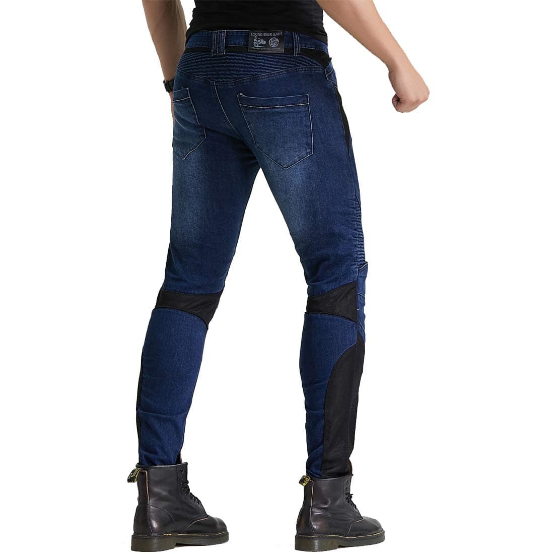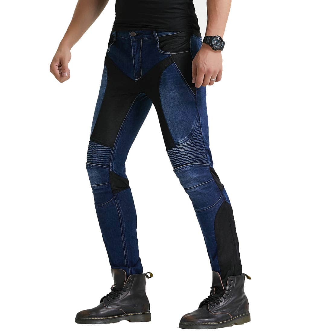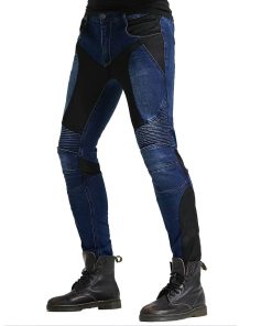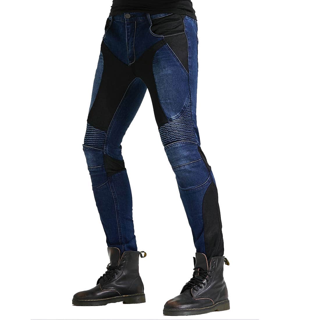 Material: 14 oz Stretch Denim Cloth, 97% Algodón, 3% Spandex. Color: Azul. Tallas: S 28, M 30, L 32, XL 34, 2XL 36, 3XL 38. Jeans de Moto con Rodilleras y Protectores de Cadera, Diseño Ajustado Recto, Estilo Casual Adecuado para la Vida Diaria. Panel de Fruncido Elástico sobre la Rodilla y Cintura Posterior para un Mejor Movimiento. Protector de Rodillas Desmontable para Diferentes Procesos de Lavado. Incluye: 1 x Jeans de Moto, 2 x Rodilleras, 2 x Protectores de Cadera.