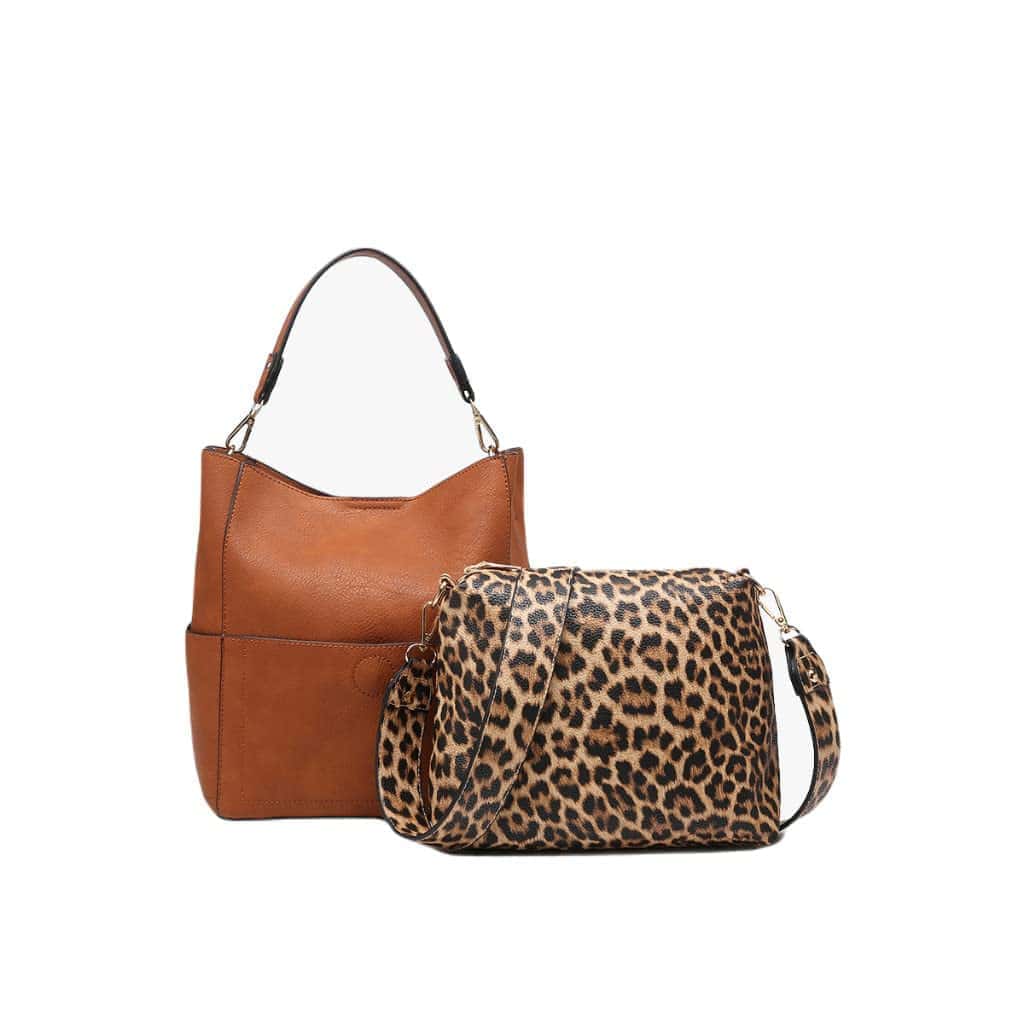 El Bolso Cubo 2-en-1 Abby de JEN & CO. con Correa de Guitarra de Estampado Animal es una manera chic de mantener todos tus esenciales al alcance de tu mano. Este estilo popular incluye un asa removible y una correa de guitarra removible que se puede adjuntar tanto al bolso principal como al interno. ¿Qué combinación de color/estampado elegirás? Cuenta con bolsillos laterales y delanteros y herrajes dorados. Hecho de cuero vegano.