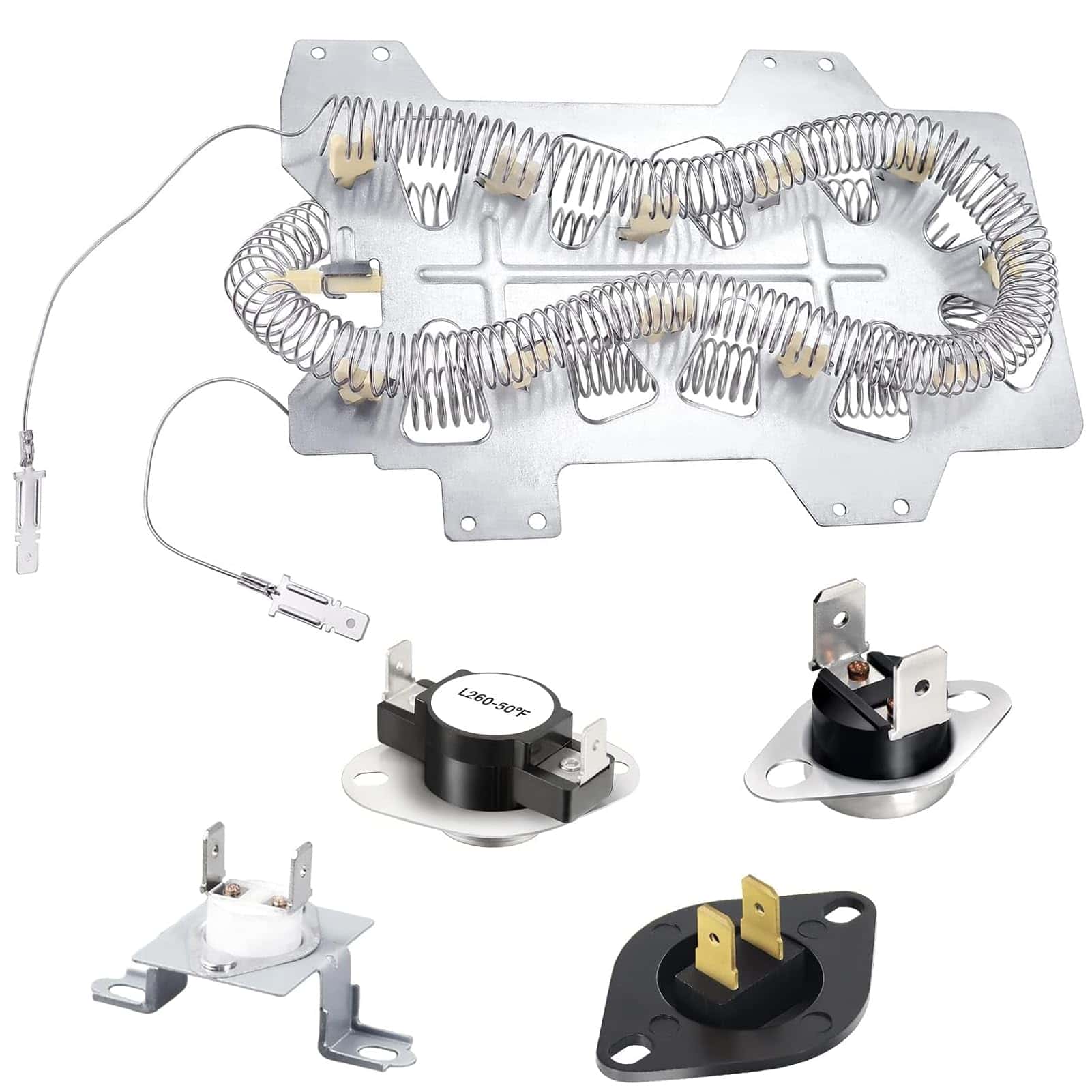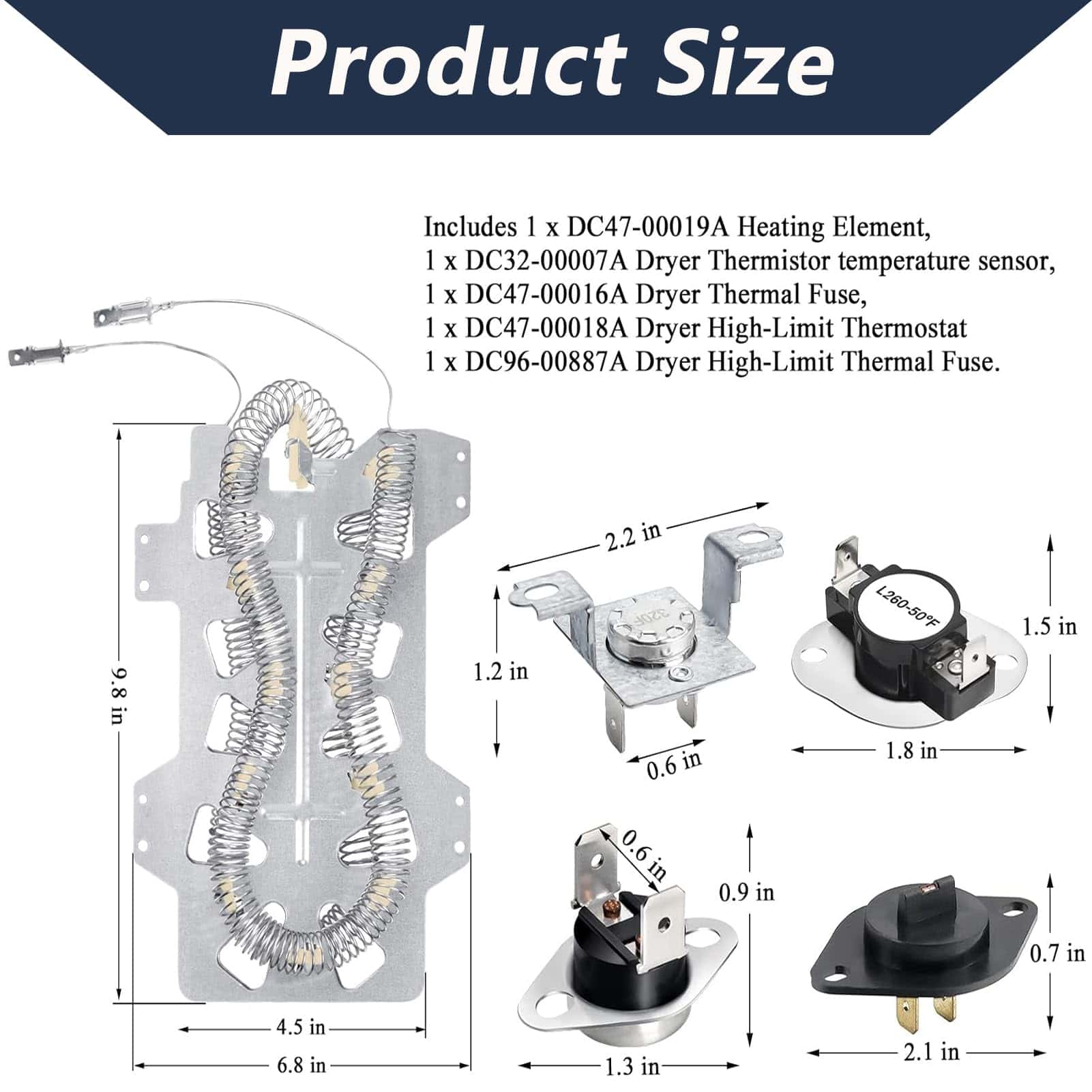 KIT DE ELEMENTO CALEFACTOR PARA SECADORA: Obtenga este paquete completo que incluye un Elemento Calefactor para Secadora DC47-00019A, un Fusible Térmico DC96-00887A, un Fusible Térmico DC47-00016A, un Termostato DC47-00018A y un Termistor DC32-00007A. Este kit solucionará cualquier problema de calefacción en su secadora Sam.sung. Los fusibles térmicos repararán secadoras que no encienden, mientras que el termostato regulará la temperatura para evitar sobrecalentamientos. El termistor monitorea y mantiene la temperatura en los niveles adecuados. Reemplace las piezas defectuosas por estas nuevas y su secadora funcionará como nueva. Consulte los números de parte de repuesto para verificar la compatibilidad con su modelo de secadora Sam.sung. Fácil de instalar: Incluso los principiantes pueden completar la instalación con herramientas simples en 30 minutos. Mire videos de YouTube para una instalación aún más sencilla. Antes de instalar el producto, apague la corriente y use guantes de trabajo para proteger sus manos. ¡Hágalo usted mismo y ahorre dinero en reparaciones de electrodomésticos!