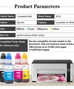 Estamos ahí cuando nos necesitas. Soporte técnico las 24 horas. Cualquier tinta defectuosa puede ser devuelta o cambiada. Paquete Contiene: 6 x compatible para epson 502 tinta negra. ( Tinta NO OEM ) Impresoras Compatibles: JETW Tinta de Recarga Compatible de Reemplazo para Epson Ecotank T502 ET-4760 ST-4000 ET-2760 ET-4850 ET-3843 ET-3830 ET-2850 ET-2700 ET-3710 ET-4850 ET-3850 ET-3750 ET-2750 ET-15000 ST-C4100 ET-3700 ET-4760 ST-C2100 ET-4750 ET-2850 ET-4750 ST-3000 ET-3760 ST-2000 ET-2750 Impresora. Rendimiento de Página: Hasta 8,600 páginas por tinta negra compatible para epson 502, Hasta 8,600 páginas por botellas de tinta de color ecotank 502. ( al 5% de cobertura en papel A4) La botella de recarga de tinta Compatible 502 está sujeta a rigurosas pruebas de instalación en la fábrica para garantizar una alta compatibilidad con la impresora Ecotank. Compatible con la tinta epson 502. El paquete combo de tinta Compatible 502 de JETW proporciona excelentes resultados de impresión. Colores vibrantes y duraderos y texto claro. Te da una experiencia diferente.