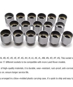 Tamaño: A, B, C, D, E, F, G, H, l, J, K, L, M, N, O, P, Q, Este juego de enchufes incluye 17 enchufes diferentes para ser compatibles con más modelos de Land Rover.