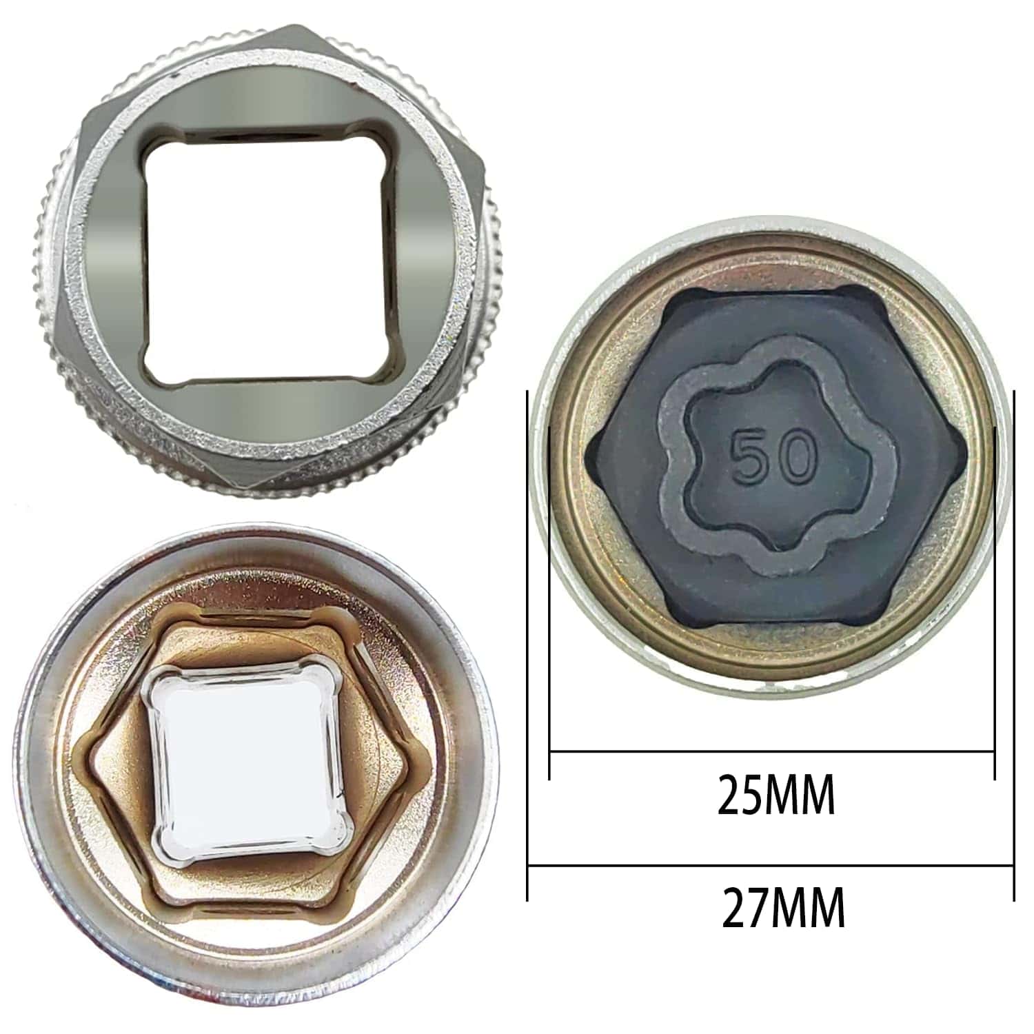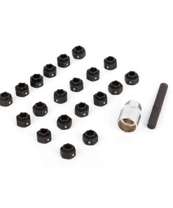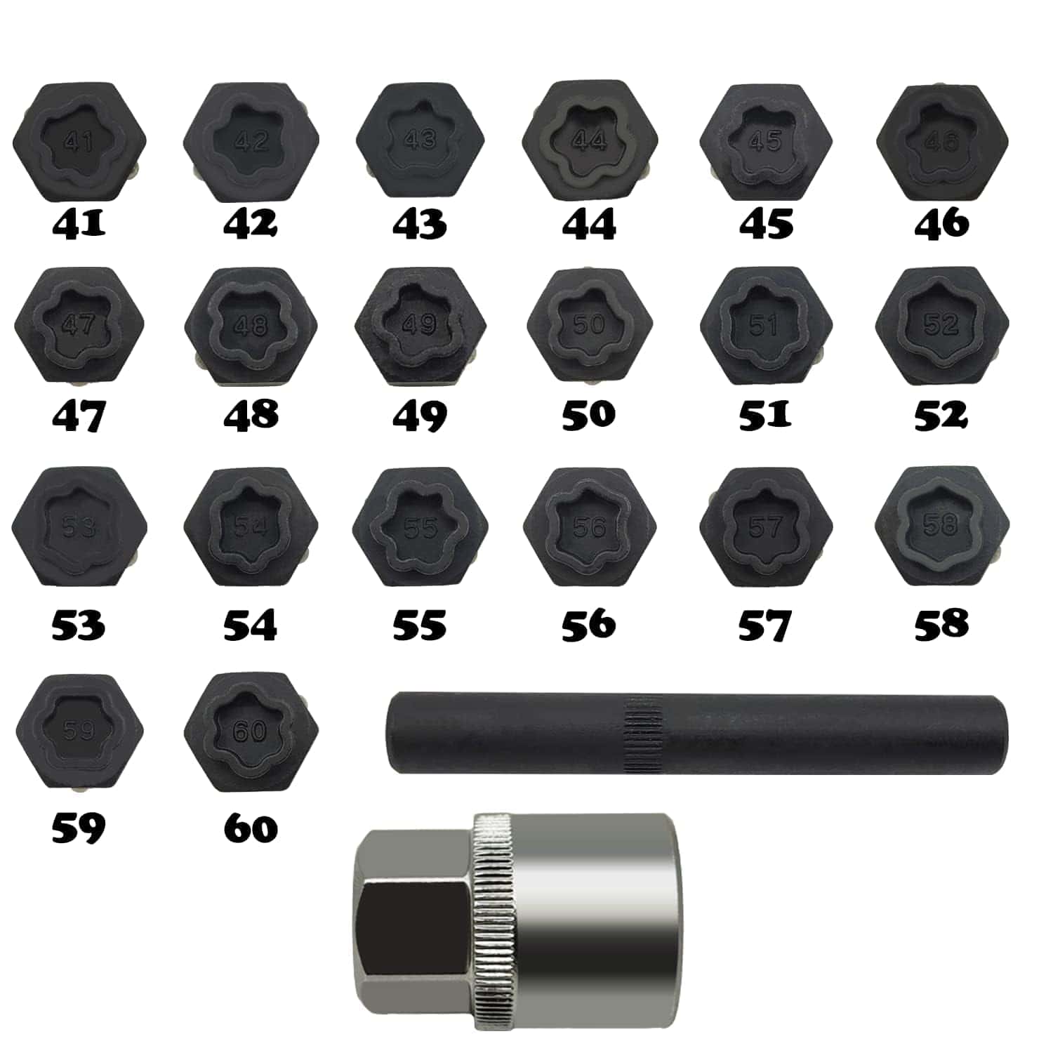 Incluye 1 x Adaptador y 1 x Punzón. El kit de extracción de tuercas antirrobo para ruedas incluye un adaptador de enchufe de 1/2″ para usar con enchufes. Además de esto, se proporciona un punzón para cambiar a un enchufe diferente para el adaptador.