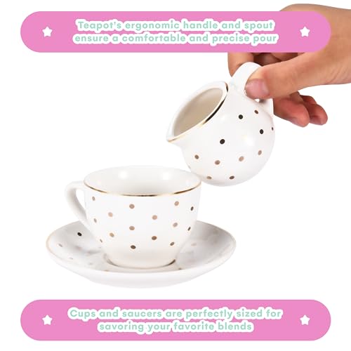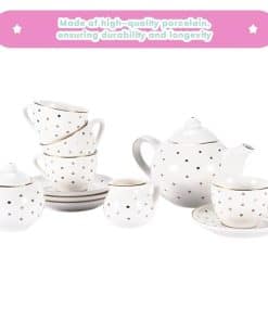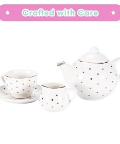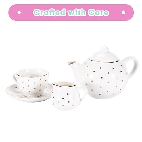 2. Juguetes Perfectos para Niñas Pequeñas: Incluye 4 platillos y 4 tazas de té, tetera con tapa, cremera, azucarera y un estuche de transporte conveniente, esmaltado a mano con un hermoso diseño de lunares. Este juego de té para niñas es un imprescindible para tu princesita.