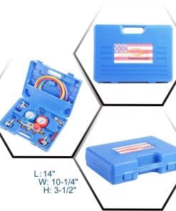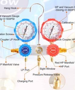 Manifold de aluminio de 3 vías JIFETOR Auto AC, duradero y anti-corrosión. Manómetro azul de baja presión con rango -30inHg~500PSI, manómetro rojo de alta presión -30inHg~800PSI, en Celsius. Dial grande de 2-3/4″ fácil de leer con escala codificada por colores, ventana de visión en el manifold para un monitoreo mejor y más sencillo de la carga de refrigerante. Tornillo de calibración incorporado y puntero sin vibraciones aseguran precisión en la medición. La válvula de purga ayuda a eliminar el aire. Perfecto para R134A R404A R410A.