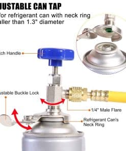 Can tap ajustable adecuado para latas de refrigerante con anillo de cuello de diámetro menor a 1.3″. El pin interno con punta afilada ayuda a perforar la botella de refrigerante de manera rápida y fácil. Estuche de moldeo por soplado personalizado que mantiene todo en su lugar y protege los manómetros durante el almacenamiento. El set incluye instrucciones detalladas, adaptador R410A (Hembra a Macho: 1/4″ a 5/16″), y kit de herramientas para reparar válvulas de manguera.