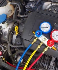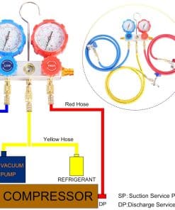 Kit de carga de refrigerante con 3 mangueras codificadas por color de 5FT, fabricadas con resina de goma nylon, con resistencia a la corrosión, baja resistencia al fluido, y alta presión de soporte para garantizar durabilidad y buen sellado de aire. La presión máxima de trabajo es de 600PSI y la presión de ruptura es de 3000PSI. Cada lado tiene conexiones hembra de latón de 1/4″ para una conexión fácil. La manguera roja conecta el lado rojo del manómetro con el acoplador rápido rojo, la azul con la azul, y la amarilla conecta el puerto de carga central del manómetro AC con el can tap o la bomba de vacío.