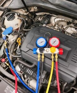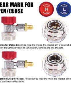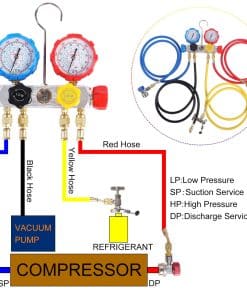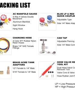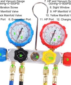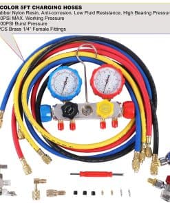 LISTA DE EMBALAJE 1x Manifold de 4 Vías para Carga de Refrigerante de AC 4x Mangueras de Carga Codificadas por Color de 5 pies 2x Acoples Rápidos Ajustables R134A 1x Pico de Lata Ajustable (Tipo de Perforación) 1x Adaptador ACME con Válvula de Cierre (1/4″ Macho a 1/2″ Hembra) 1x Adaptador de Tanque en Forma de L (1/4″ Macho a 5/16″ Hembra) 1x Kit de Reparación de Válvula de Manguera 1x Estuche de Moldeo por Soplado, 14″Lx12″Anx3-1/2″Al 1x Instrucción Para refrigerantes R404A R134A R22 R410A. Perfecto para la evacuación/vacío del aire acondicionado automotriz y doméstico, comprobación de diagnóstico, carga de refrigerante y recuperación CARACTERÍSTICAS 1. El refrigerante es corrosivo. Nuestro manómetro está equipado con cuerpo de manifold de aluminio y mangueras de resina de nylon de goma, anti-corrosión, baja resistencia de fluidos, alta resistencia a la presión, garantizan durabilidad y buena estanqueidad al aire. 2. Acople rápido R134a, el pin interno ajustable reduce el desgaste de la válvula Schrader en el puerto de servicio de AC, y asegura la estanqueidad al conectar y desconectar. 3. Pico de lata ajustable, ampliamente utilizado para latas de refrigerante con anillo de cuello de menos de 1.3″ de diámetro NOTA 1. Por favor, use guantes y gafas cuando lo use 2. Estos kits de recarga de refrigerante de ac deben ser utilizados por profesionales o bajo la orientación de un profesional 3. Siempre consulte las instrucciones de operación del fabricante del equipo, compare con las lecturas recomendadas por el fabricante 4. No use este manómetro de AC cuando la presión sea superior a la escala máxima del manómetro de alta presión 5. No lo utilice como regulador de presión 6. Asegúrese que el puntero apunte a cero antes de usarlo. Si no es así, desenrosque la pantalla del dial y restablezca el puntero ajustando el tornillo de calibración 7. No hay válvula de purga para la línea amarilla. Puede aflojarla un poco para llenar la línea con freón antes de abrir la válvula. Use guantes para evitar quemaduras por congelación 8. Cuando use el acople rápido ajustable para abrir la válvula Schrader del puerto de servicio de AC, detenga el giro después de que el puntero del manómetro comience a moverse. Si continúa girando apretado, puede desgastar la válvula Schrader