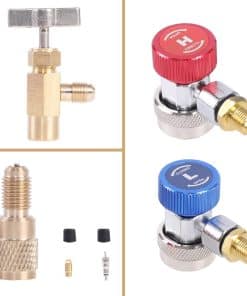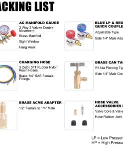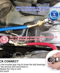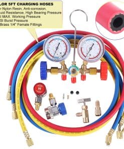 El Juego de Manifold de AC de 3 Vías de JIFETOR es la herramienta de carga y diagnóstico perfecta para el aire acondicionado automotriz y doméstico. Este conjunto incluye un manifold de latón de 3 vías con manómetros de presión alta y baja para R404A R134A, mangueras de 5 pies codificadas por colores, acopladores rápidos ajustables R134A, can tap y adaptador de latón. El manifold está hecho de latón duradero y anticorrosión, con un dial grande y fácil de leer con escala codificada por colores y ventana de visualización para facilitar el monitoreo de la carga y recuperación de refrigerante. Las mangueras de 5 pies están hechas de resina de nylon de goma para resistir la corrosión y alta presión, con conexiones hembra de latón de 1/4″ en cada extremo para una fácil conexión. Los acopladores rápidos ajustables encajan de forma segura en los puertos de servicio R134A y se abren y cierran fácilmente girando la perilla roja/azul. El can tap y el adaptador de latón están diseñados para una fácil conexión a los botes de refrigerante R134A. Este juego de herramientas es ideal para la evacuación, carga y recuperación de refrigerante, y viene con instrucciones detalladas para facilitar su uso en el mantenimiento del aire acondicionado.
