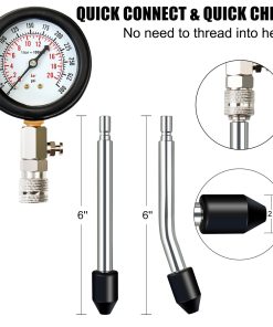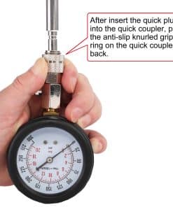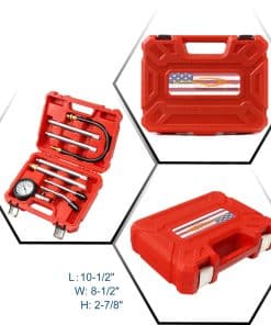Este kit de probador de compresión de motor incluye una manguera de extensión flexible de 16 pulgadas de largo, fabricada con material de resina de nailon de goma premium, a prueba de explosiones. Un lado está equipado con un acoplador rápido para conectar con el manómetro de compresión, y el otro lado con conexiones de latón de 14 milímetros, que pueden conectarse directamente al orificio de la bujía o pueden combinarse con una varilla de extensión para conectar el orificio de la bujía. El kit de prueba de compresión del cilindro del motor viene con 4 varillas de extensión rectas con rosca métrica fabricadas en aluminio de alta calidad. Permite un acceso fácil a los orificios de bujías empotrados al realizar pruebas de compresión. Las varillas de varios tamaños se combinan con los accesorios roscados de metal, adaptándose a diferentes modelos y extendiendo la distancia de trabajo. Tamaños múltiples: M10 1, M12 1.25, M14 1.25, M18 1.5 milímetros. Solo la varilla más larga termina con un adaptador de latón. Los conectores rectos y angulados de empuje en el kit de prueba del compresor de cilindros del motor de la motocicleta están equipados con una punta cónica de goma para una instalación fácil y rápida, solo necesita empujar y mantenerla sellada contra la culata, en lugar de atornillar para apretar como los adaptadores apropiados de 10, 12, 14, 18 milímetros. Estos conectores de empuje son perfectos también para algunos tipos y profundidades en el pozo de la bujía, a los que los adaptadores apropiados no encajan. El estuche moldeado por soplado incluye 1 pieza de manómetro de compresión, 4 piezas de varillas de extensión, 2 piezas de conectores rápidos de empuje, 1 pieza de manguera de extensión larga e instrucciones detalladas. Fácilmente accesible y organizado en un resistente estuche de plástico resistente al desgaste, para un transporte fácil, un almacenamiento sencillo y una rápida identificación. Hebillas de cierre para mayor seguridad y asa moldeada para viajes cómodos. Ofreciendo un sentido de uso perfecto y durabilidad para su proyecto.