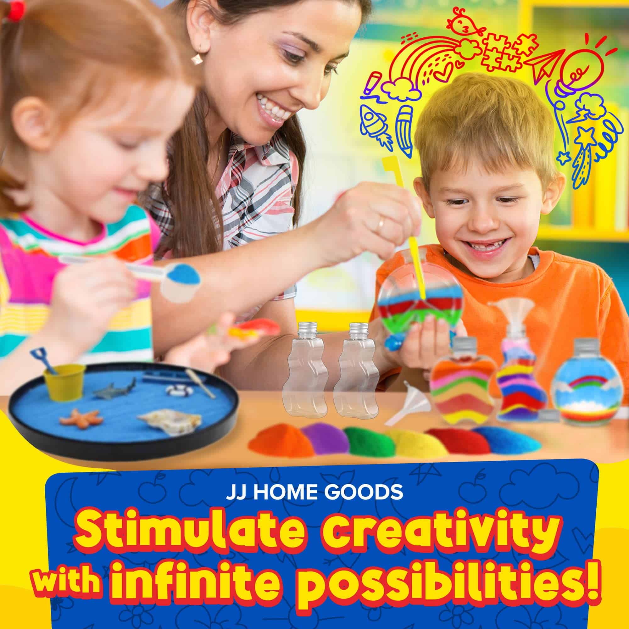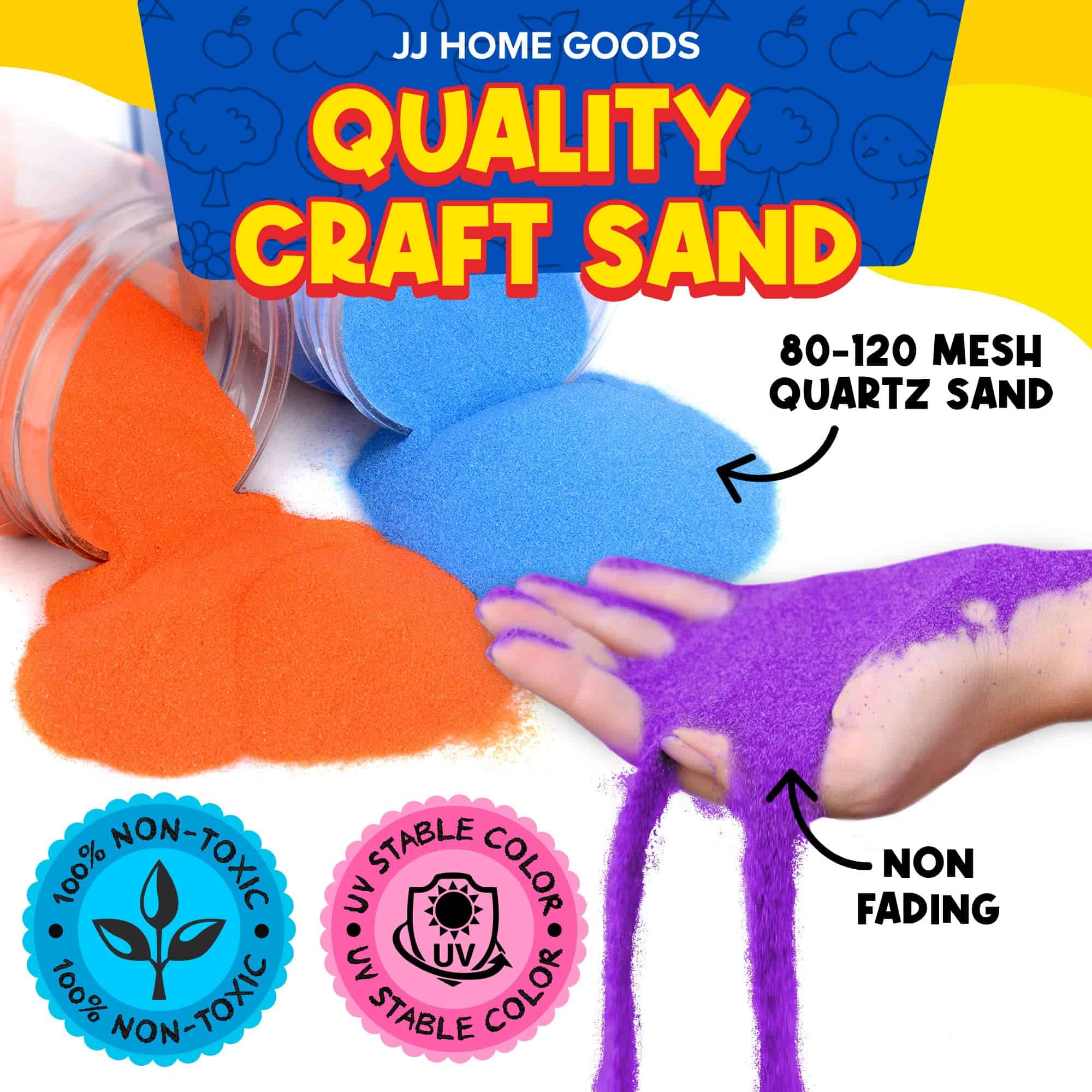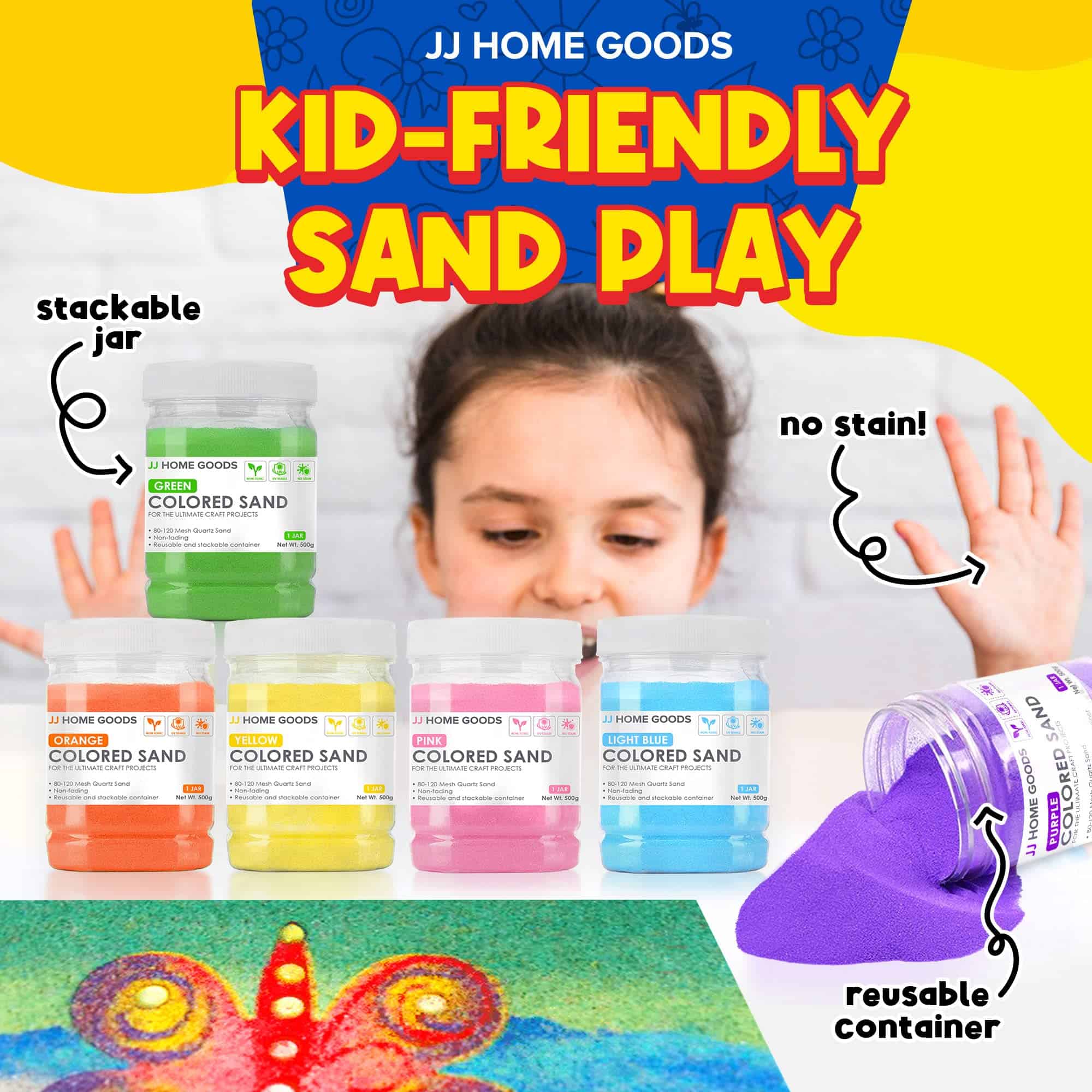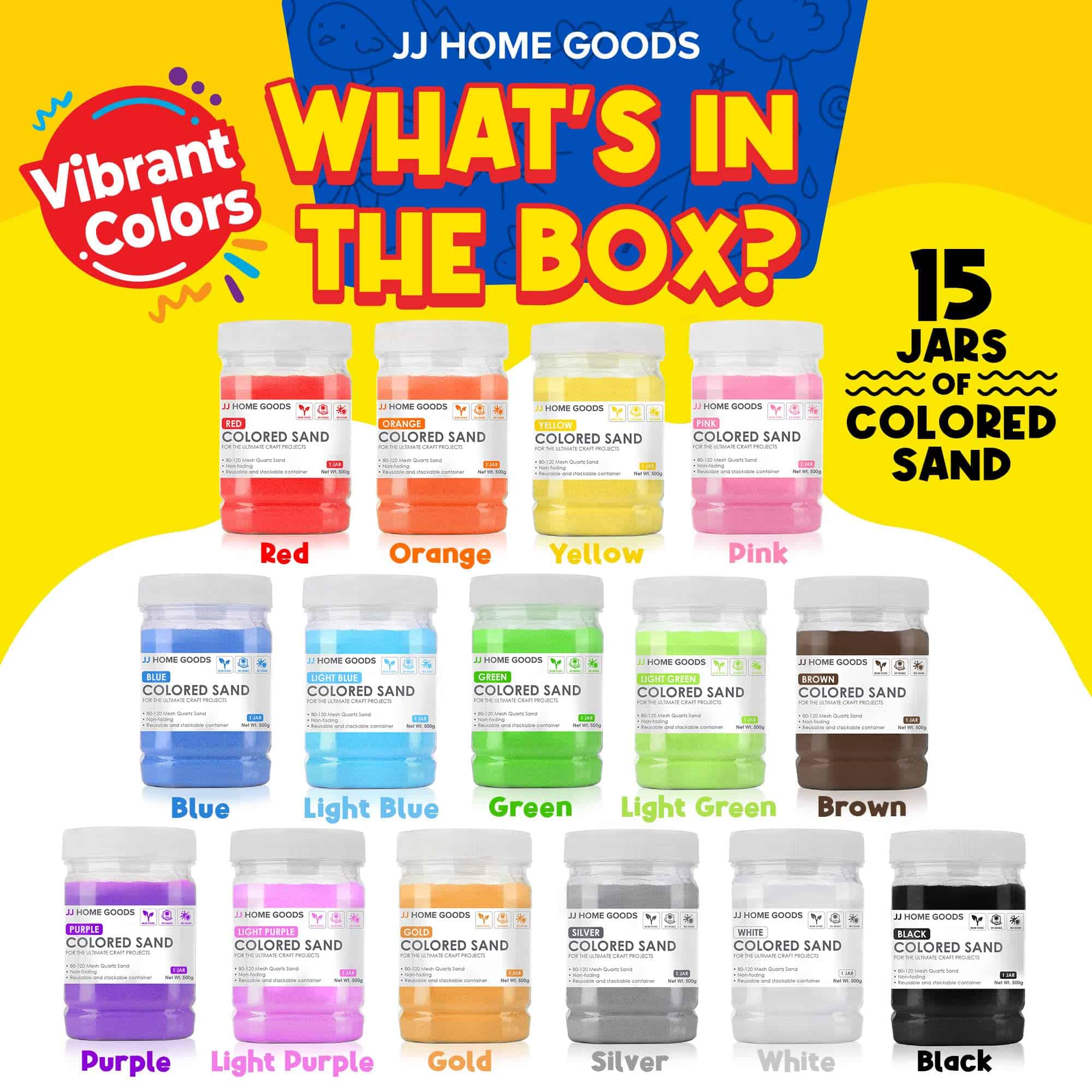 1. 15 COLORES VIBRANTES: La arena de colores JJ Care es perfecta para un kit de arte de arena y paquetes de manualidades para niños. Nuestra arena de colores viene con 15 colores clásicos surtidos: Rojo, Naranja, Amarillo, Verde, Azul, Morado, Rosa, Oro, Blanco, Negro, Morado Claro, Azul Claro, Verde Claro, Plata y Marrón. Esta arena de colores para niños se utiliza a menudo en actividades escolares y de jardín de infantes, cajón de arena de bricolaje, juegos en el patio, juego en el jardín, dibujo en la arena, trucos de magia, colección de botellas de purpurina y proyectos de jarrones, ¡decorativos!.