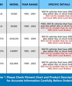 2. COMPATIBILIDAD DEL VEHÍCULO – Rodamiento de Rueda JLEO compatible con Toyota Avalon 1995-2004, Camry 1992-2001, Solara 1999-2003 para modelos con ABS, no apto para modelos que no tienen ABS (Frenos Antibloqueo).