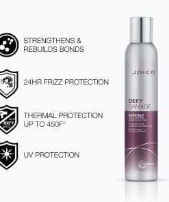 Conquista el temido frizz con Joico Defy Damage Invincible Frizz-Fighting Bond Protector – el spray de construcción de enlaces que protege instantáneamente el cabello de la humedad, el daño térmico y los efectos de la contaminación durante 24 horas completas.