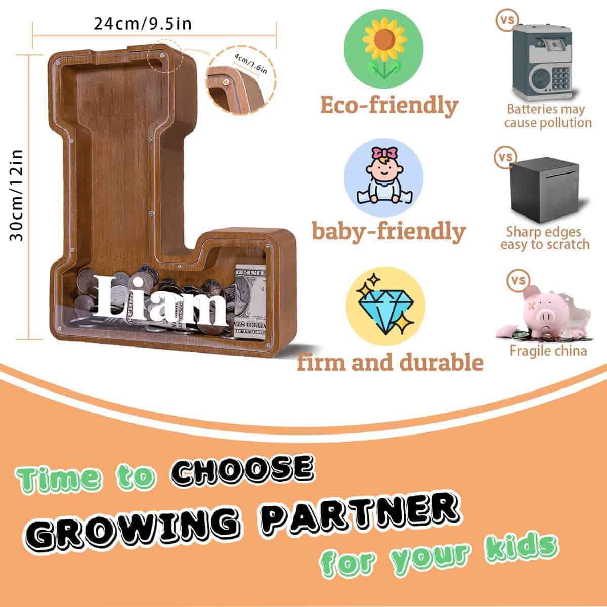 Cada alcancía de madera de letra grande está fabricada de una sola vez por una máquina CNC a partir de una madera ecológica y sostenible de primera calidad para un atractivo natural y duradero, durabilidad y uso duradero. La alcancía de letra personalizada está meticulosamente pulida con diez rondas de máquina y dos rondas manuales para crear una sensación suave y delicada al tacto. Tratada con aceite mineral de grado alimenticio y cera de abejas, no se utilizan pinturas ni tintes. Es 100% seguro, libre de toxinas y libre de formaldehído. A través del panel acrílico transparente de la alcancía de letra del abecedario, los niños pueden monitorear fácilmente el crecimiento de los ahorros, haciendo un progreso tangible hacia metas. Desenrosque para un acceso sin problemas a los ahorros, esta alcancía de monedas del abecedario es un juguete educativo reutilizable de primera calidad para fomentar la alfabetización financiera en los niños y promover una cultura de ahorro desde temprana edad. Más allá de elegir una alcancía inicial con la inicial correspondiente para familiares o amigos, puedes personalizarla aún más grabando mensajes únicos o nombres en la alcancía de madera personalizada. El panel acrílico puede ser adornado con dibujos exclusivos utilizando marcadores a base de agua. Un regalo perfecto para niños, recién nacidos, niños y niñas de cualquier edad, para Baby Shower, Día del Niño, Regreso a Clases, Día de Acción de Gracias, Navidad, Cumpleaños, etc. La alcancía inicial tiene una altura de 12 pulgadas y presume de un grosor de 1 pulgada para una mayor capacidad, lo que le permite mantenerse estable en cualquier superficie. Su estructura resistente, hecha de materiales duraderos, combinada con una mano de obra exquisita, la hace adecuada no solo como alcancía de letra de madera, sino también como decoración, caja de tarjetas de boda, caja de charcutería o caja de aperitivos. Estamos comprometidos en ofrecer productos de alta calidad, seguros y rentables. La satisfacción del cliente es nuestra misión. Si tienes alguna pregunta, no dudes en contactarnos. Responderemos en un plazo de 12 horas y proporcionaremos la mejor solución posible.