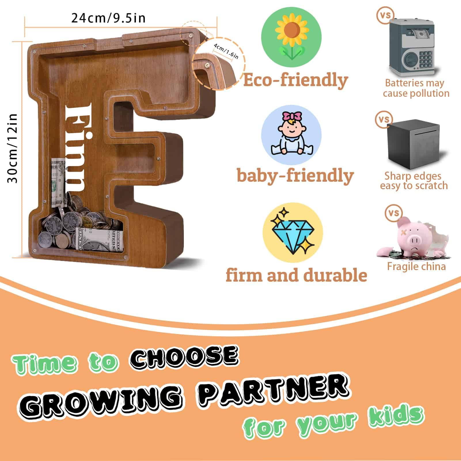 1. SEGURIDAD Y RESISTENTE: Cada hucha de madera en forma de letra grande está elaborada de una sola vez por una máquina CNC a partir de una madera de primera calidad, ecológica y sostenible para un atractivo natural, durabilidad y uso de larga duración. La hucha de letra personalizada está meticulosamente pulida con diez rondas de máquina y dos rondas manuales para crear un tacto suave y delicado. Tratada con aceite mineral comestible y cera de abejas, no se utilizan pinturas ni tintes, es 100% segura, libre de toxinas y libre de formaldehído.
