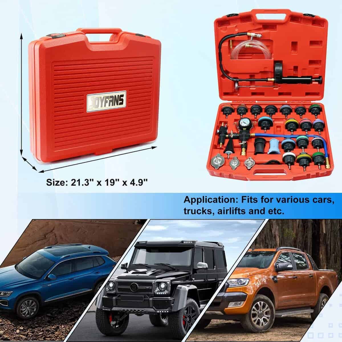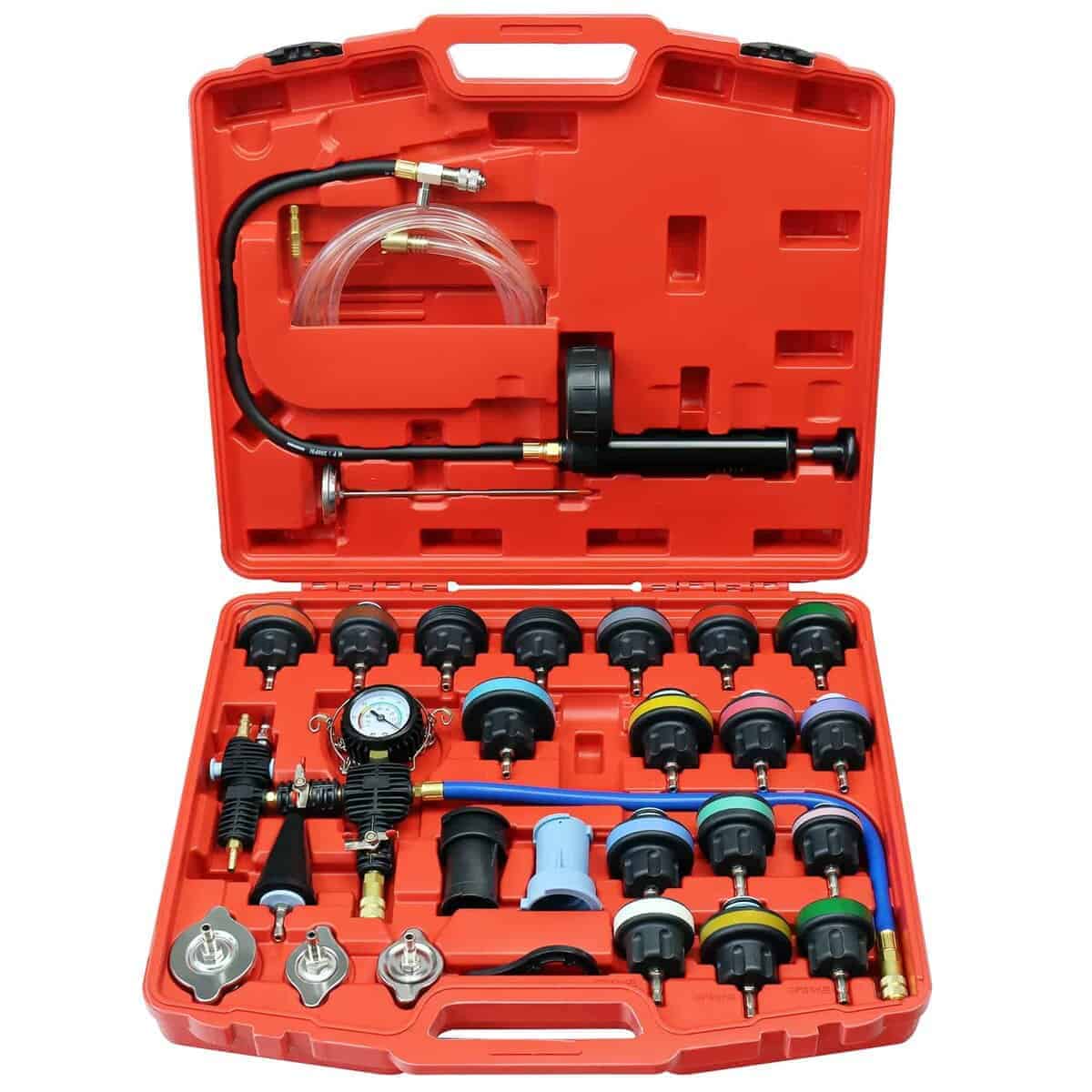 Kit de prueba de presión del refrigerante se adapta a GM, BMW, VW, GMC, Porsche, Chevy, Dodge, JEEP, Chrysler y muchos otros autos nacionales y extranjeros, mientras trabaja con 20PCS de adaptadores dedicados para operación de una sola persona. Se adapta a la mayoría de los modelos mientras trabaja con el adaptador universal cónico, pero se requieren 2 personas para operar (una persona sostiene la cabeza cónica y la otra bombea). Bomba de prueba manual con indicador calibrado de 0-35psi, 0-2.5bar. La herramienta de purga de vacío del refrigerante neumático proporciona un enjuague eficiente mientras alimenta el sistema con refrigerante fresco bajo vacío. La técnica rápida y limpia no permite que quede aire atrapado. Características de diseño de conexión rápida. Rango de trabajo: -60 a -50 cmHg (-23 a -20 inHg). Funciona con adaptadores específicos y adaptador universal, esta herramienta de relleno del sistema de enfriamiento puede adaptarse a casi todos los tipos de modelos de vehículos, operable por una sola persona. Se requiere bomba de vacío, pero no incluida. Juego de herramientas completo de 28 piezas que incluye probador de presión del radiador, herramienta de relleno del refrigerante neumático por vacío, medidor de temperatura, adaptadores de radiador, mangueras, accesorios y una caja robusta para mantener todo ordenado. Hay instrucciones detalladas para referencia, si tiene algún problema operativo, contáctenos para la comunicación. Medidor de temperatura opera a 32 – 400 grados Fahrenheit.