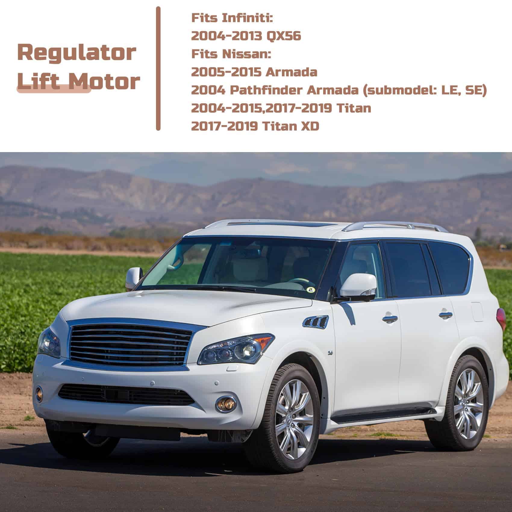 1. Compatibilidad: Este Motor de Elevación de Ventana del lado Izquierdo Delantero es compatible con Infiniti QX56 2004-2013 | Nissan Armada 2005-2015, Pathfinder Armada 2004, Titan 2004-2019, Titan XD 2017-2019.