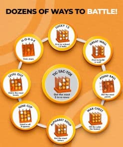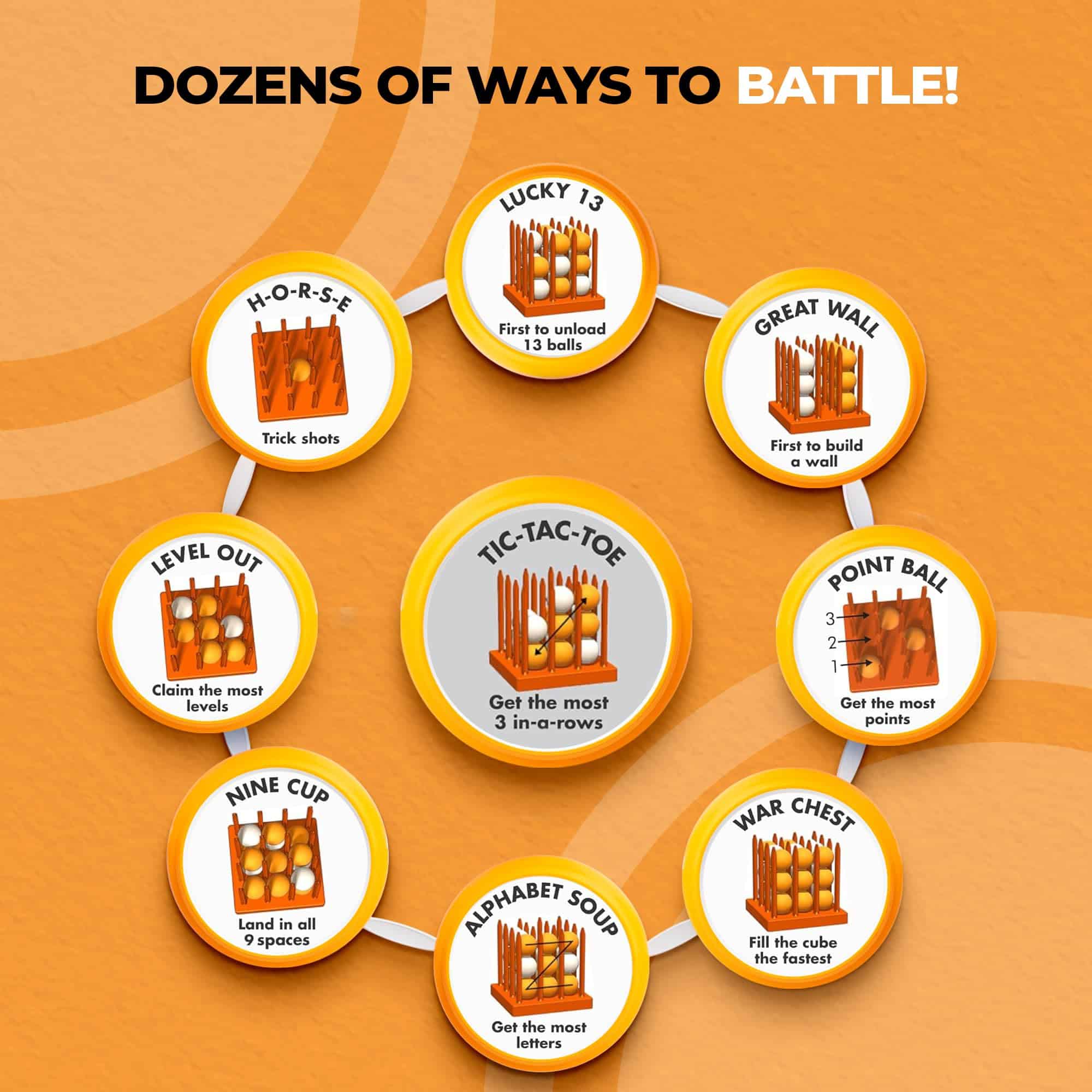 Batalla H-O-R-S-E (Tiro de Truco): Se el único jugador en no deletrear «HORSE». Los jugadores reciben una letra cuando no logran emparejar el tiro de truco original. Coloca el cubo en cualquier lugar y rebota desde cualquier ubicación. Incluye: Un cubo de juego de madera, 27 bolas blancas y naranjas de alta calidad e instrucciones.