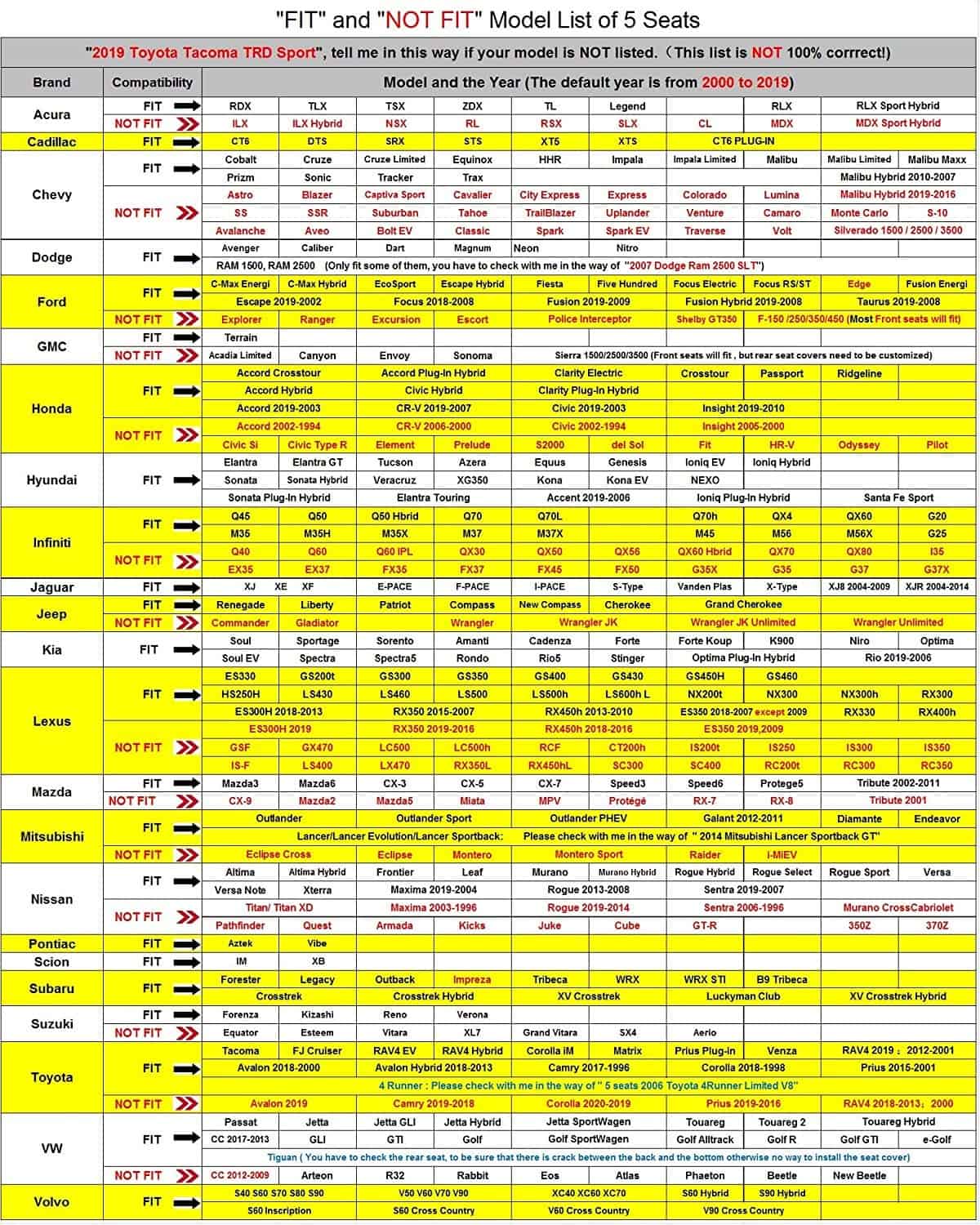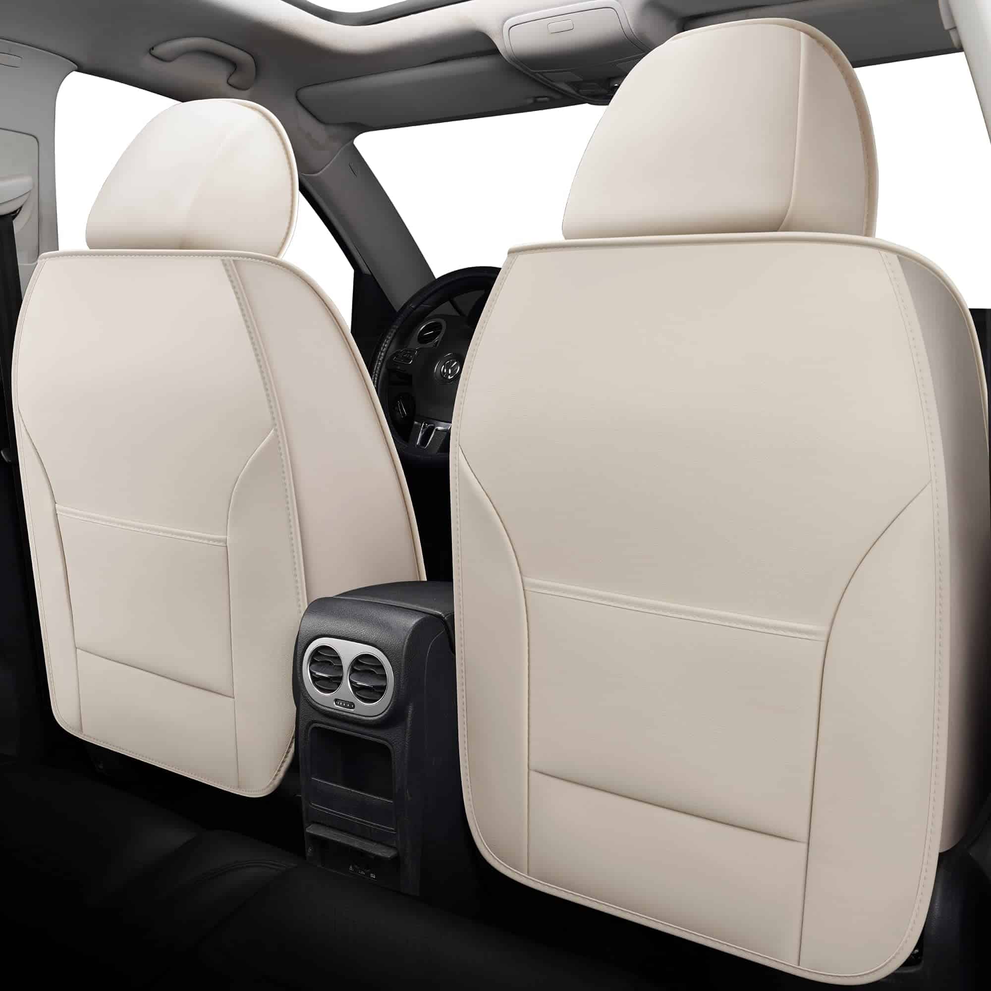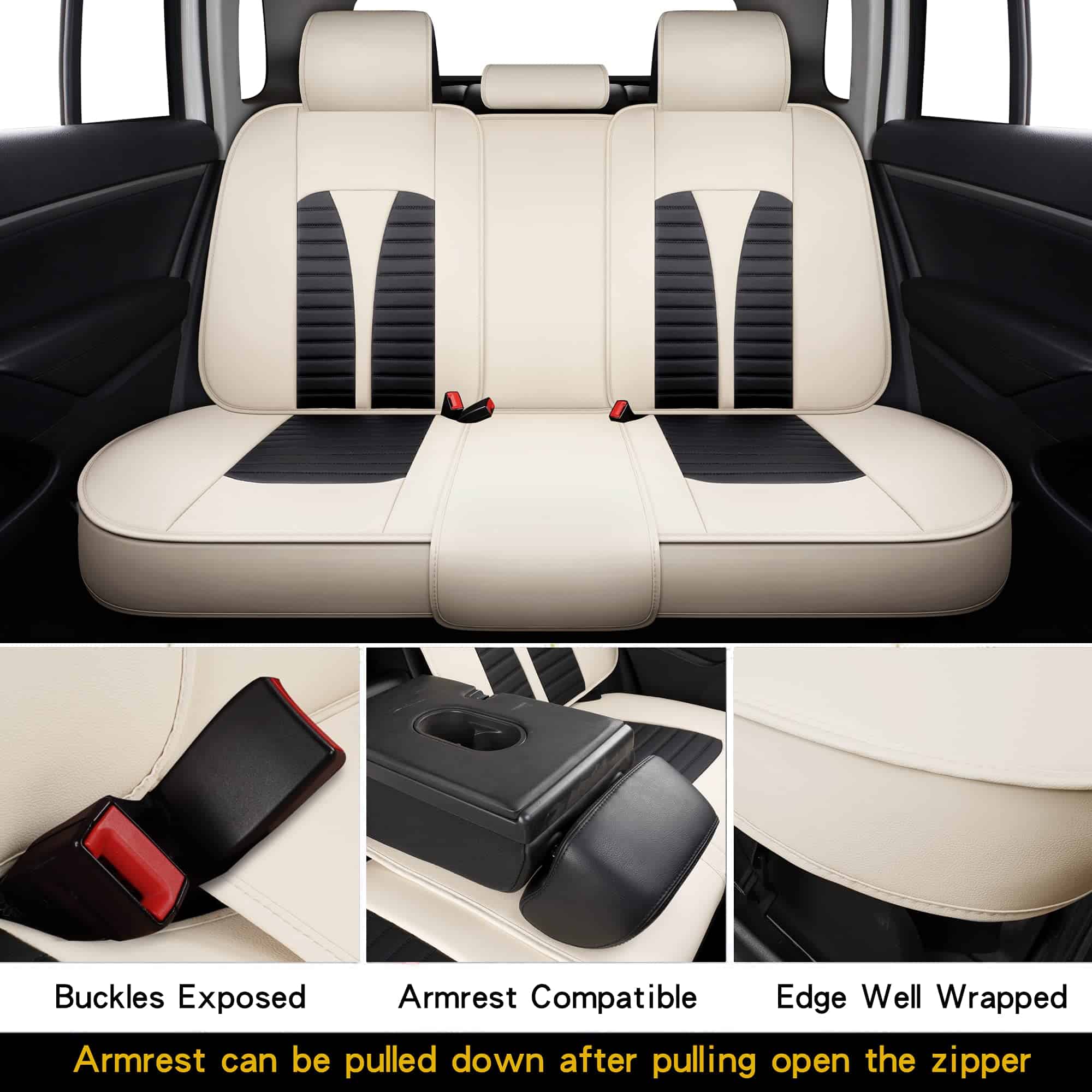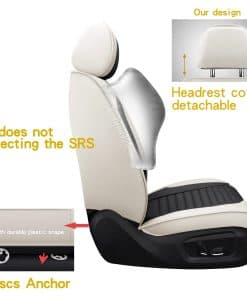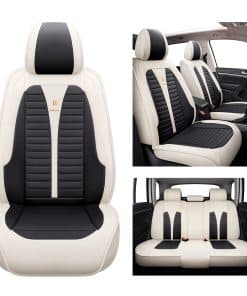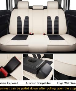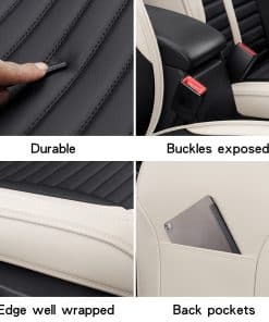 1. ¿Qué hay en el paquete? El juego completo de fundas de asientos de cuero Isen-CoverAuto incluye fundas para los asientos delanteros y traseros para 5 asientos, 1 paquete de accesorios de instalación y 1 paquete de papel de instalación. Por favor, verifique todos los artículos cuando reciba el paquete. 2. Aplicación de estaciones Esta lujosa funda de asiento de coche de cobertura total puede ser adecuada para todas las estaciones. El material exterior es cuero sintético que se puede utilizar durante todo el año. Por lo tanto, no es necesario comprar una en verano y otra en invierno. 3. Compatibilidad La funda de asiento automotriz es compatible de forma universal con Ford, Chevrolet, Buick, Volkswagen, Toyota, Honda, Nissan, Mazda, Mitsubishi, Hyundai, Kia, Jeep y la mayoría de los coches, SUVs y camionetas. Mientras tanto, nuestro cojín para asiento de auto tiene un maravilloso envolvimiento con los asientos del coche que puede maximizar la protección de los asientos. Hemos dejado salir las bolsas de aire, por lo que una vez que ocurra un accidente, las bolsas de aire seguirán funcionando. 4. Limpieza y Durabilidad Este protector de asiento de coche negro y crema es bastante fácil de limpiar cuando sus hijos o mascotas lo manchan. Es impermeable, por lo que puede usar directamente el paño húmedo en él. Y cuando se trata del cuidado rutinario, puede tratarlo de la misma manera que su bolso de cuero. El cuero sintético que utilizamos no es fácil de dañar o romper con las llaves, las patas de las mascotas u otro metal afilado. Y tampoco es fácil de quemar, ya que utilizamos un tipo de material que contiene retardante de fuego dentro de la funda de asiento. 5. Servicio postventa La instalación de esta funda de asiento de cuero no es compleja. Puede instalar la funda de asiento usted mismo a través del video de instalación paso a paso y también puede leer las instrucciones de instalación dentro del paquete. Tenemos un equipo de resolución de problemas disponible y si tiene alguna pregunta, puede encontrarnos rápidamente y haremos todo lo posible para ayudarlo. Así que solo inténtelo y estamos seguros de que estará satisfecho con nuestros productos.