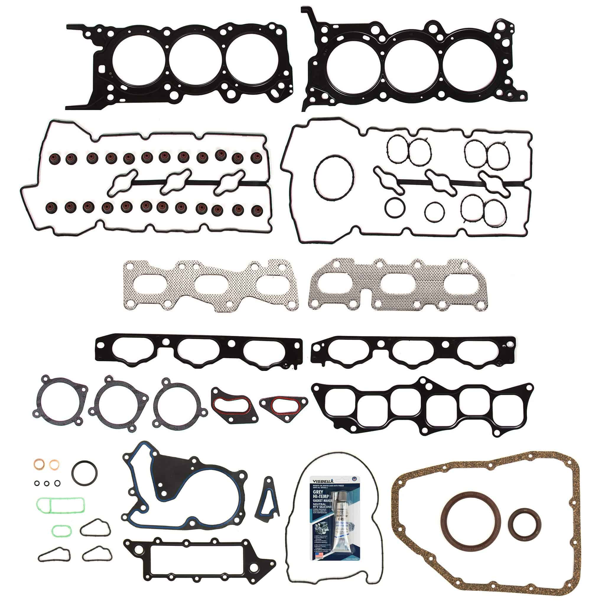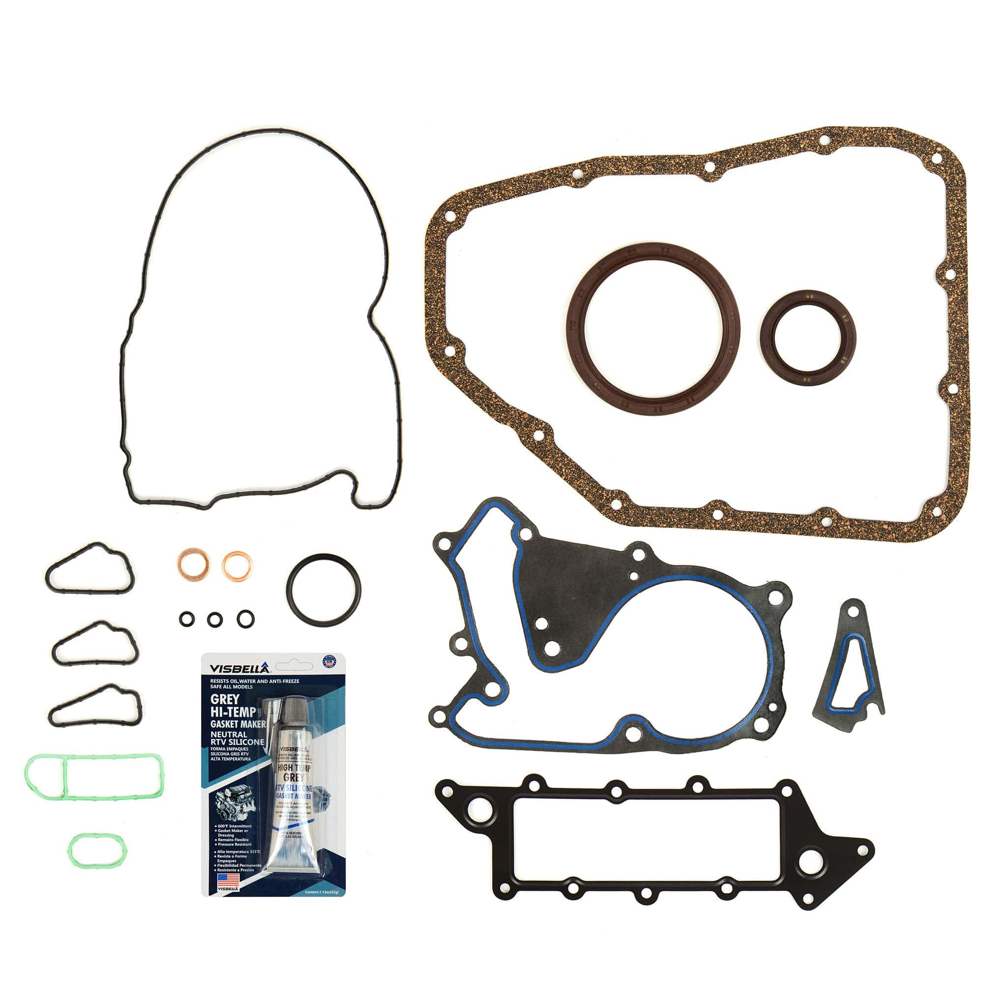 Este artículo incluye: Junta de culata de acero de múltiples capas (MLS), Junta de tapa de válvula, Sellos de vástago de válvula, Junta de múltiple de admisión, Junta de múltiple de escape, Sello de leva delantero, Anillos tóricos, Sello de cigüeñal delantero, Sello principal trasero, Junta de bomba de agua, Otras juntas pequeñas, Silicona RTV.