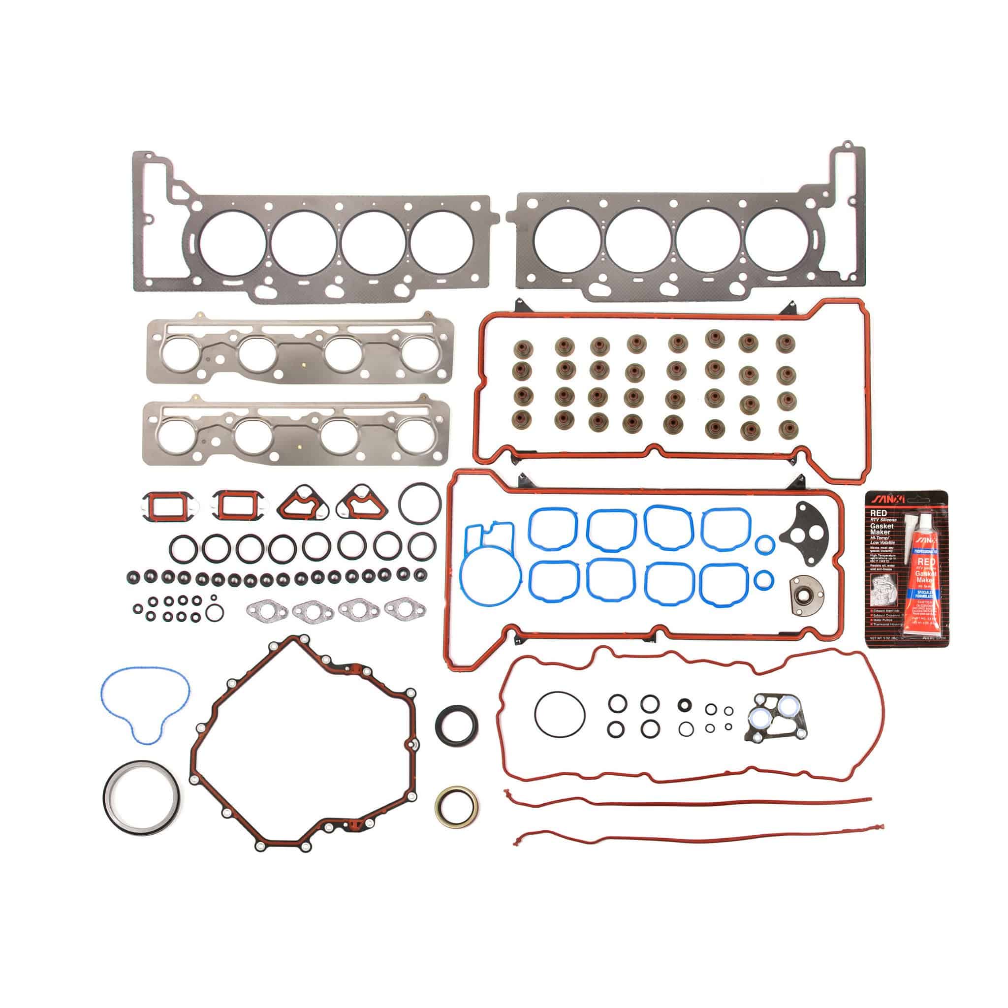 Este conjunto incluye: Junta de la Culata de Grafito, Junta de la Tapa de Válvulas, Sellos de Vástago de Válvula, Junta del Múltiple de Admisión, Junta del Múltiple de Escape, Sello del Árbol de Levas Delantero, Anillos en O, Sello del Cigüeñal Delantero, Sello Principal Trasero, Junta de la Bomba de Agua, Otras Juntas Pequeñas, Silicona RTV