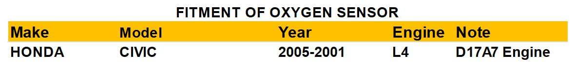 1. Número de Parte de Repuesto 234-4123 234-4092. 2. Incluye 2 Sensores de Oxígeno. 3. Aplicación de Repuesto para Honda Civic 2005 2004 2003 2002 2001 Motor D17A7 1.7L. 4. Verifique su información con Garage de Compatibilidad (marca, modelo y nivel de acabado) y número OEM antes de comprar. Se ajustará a su vehículo cuando el enchufe, la longitud y la posición sean iguales que su sensor de oxígeno original. 5. Instalación sencilla sin necesidad de modificaciones. Las roscas pre-recubiertas facilitan el proceso de instalación. 6. Ubicación de los sensores en el vehículo: Sensor 1 Arriba a la derecha/trasero; Sensor 2 Arriba a la izquierda/delantero; Sensor 1 Abajo a la derecha/trasero; Sensor 2 Abajo a la izquierda/delantero; sensor 1 Arriba, sensor 2 Abajo. 7. Fabricado con materiales resistentes a altas temperaturas para garantizar tiempos de respuesta rápidos y durabilidad. Cuerpo de acero inoxidable con doble soldadura láser completamente sumergible para una vida útil prolongada.