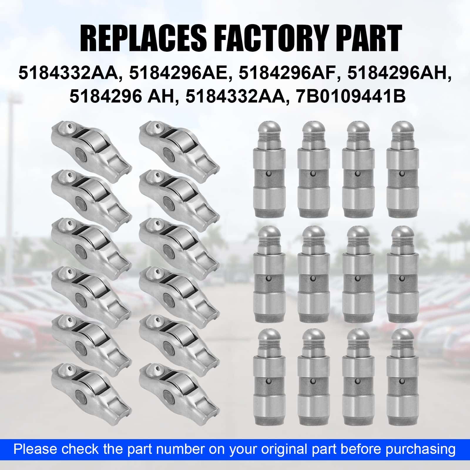1. COMPATIBILIDAD EXACTA Jeep Cherokee 2014-2020 Jeep Wrangler 2014-2018 Jeep Grand Cherokee 2011-2019 Dodge Durango 2011-2015 Dodge Grand Caravan Journey 2011-2018 Dodge Challenger Charger 2011-2020 Dodge Avenger 2011-2014 Chrysler 300 2011-2019 Chrysler 200 2011-2017 Chrysler Town & Country 2011-2016 Ram 1500 2013-2019 Ram Promaster 1500 2500 3500 2014-2018 motores de 3.0 3.2 3.6 3.0L 3.2L 3.6L. 2. NÚMERO DE PARTE DE OE 5184332AA, 5184296AE, 5184296AF, 5184296AH, 5184296 AH, 5184332AA, 7B0109441B. 3. ALTA CALIDAD Cada brazo basculante está fabricado solo con los mejores materiales y procesos de fabricación, se recomienda instalar nuevos brazos basculantes y componentes con cada reconstrucción del motor para garantizar una larga vida del motor y el rendimiento más eficiente. 4. CONTENIDO DEL PAQUETE 12 x Juego de Brazo Basculante y Elevador. 5. COMPRA CON CONFIANZA TEMSONE ofrece 1 año de soporte de calidad del producto a nuestros clientes. Si tiene alguna duda sobre cualquier problema, por favor contáctenos.