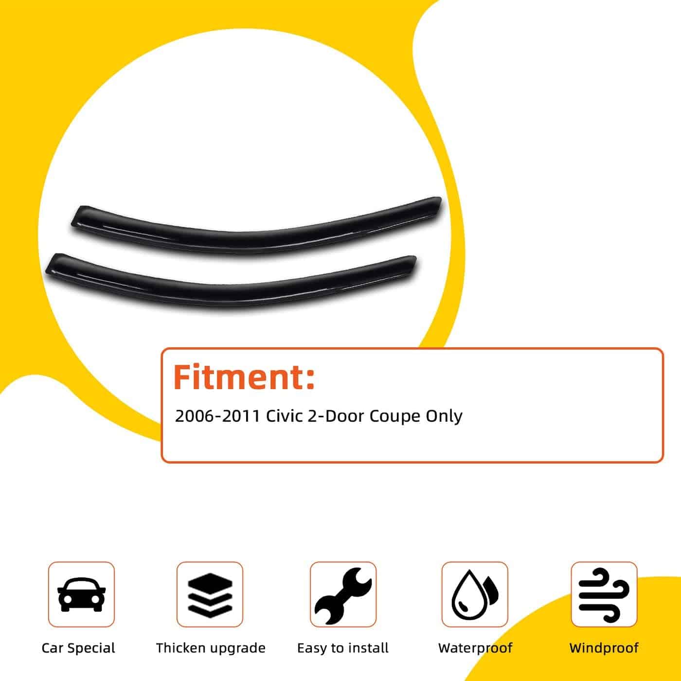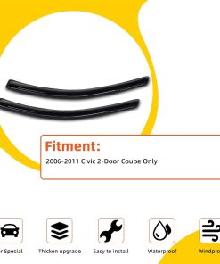 Juego de 2 deflectores de sol/lluvia para ventanas exteriores compatibles con Civic 2 puertas Coupe 06-11. Compatible con Civic Coupe de 2 puertas 2006-2011. Especificaciones: Color: Humo; Material: Acrílico reforzado; Cinta 3M. Ayuda a reducir la acumulación de calor en vehículos estacionados permitiendo que entre aire cuando está parcialmente abierto. Protege completamente la ventana del sol, viento, lluvia y la nieve. Tipo de instalación: Estilo de montaje exterior (no estilo en el canal). Por favor revise la imagen de instalación que publicamos como referencia. Garantía: Garantía limitada de 6 meses. Material duradero diseñado para resistir las inclemencias del tiempo.
