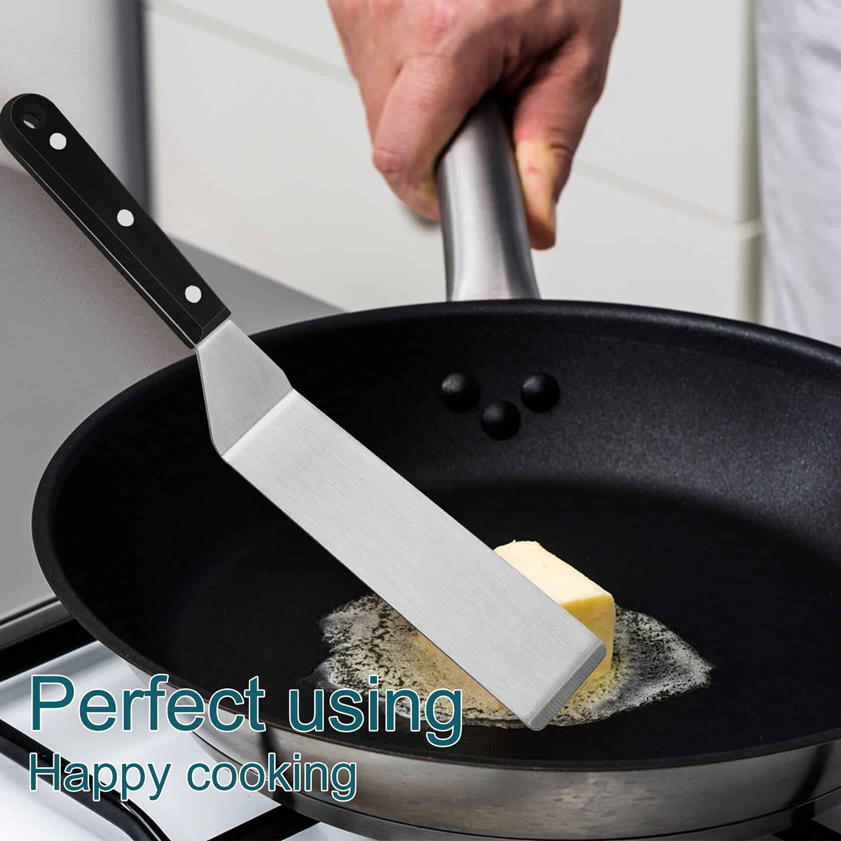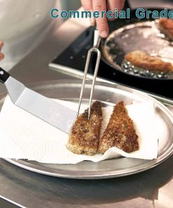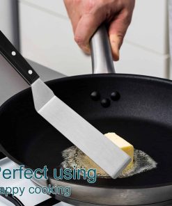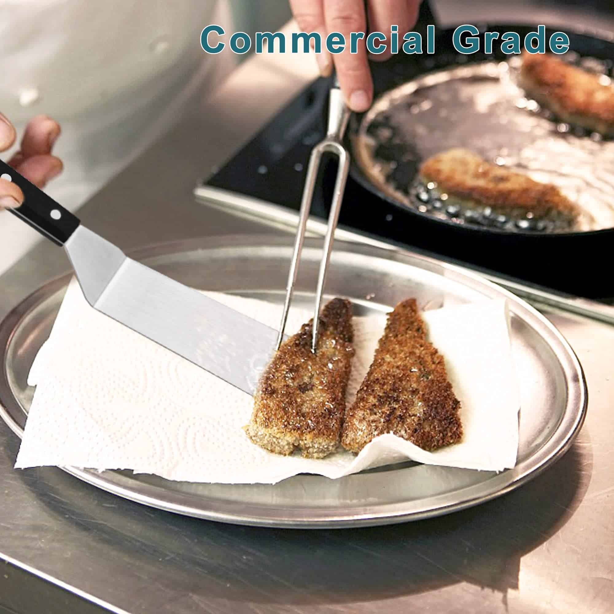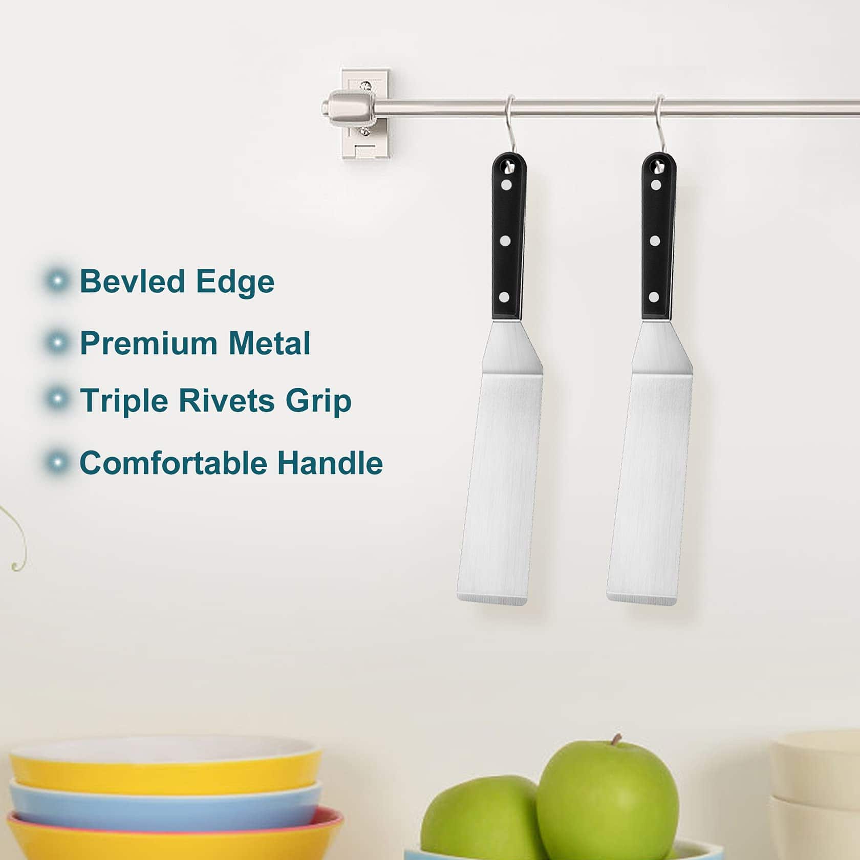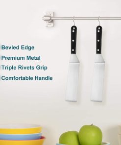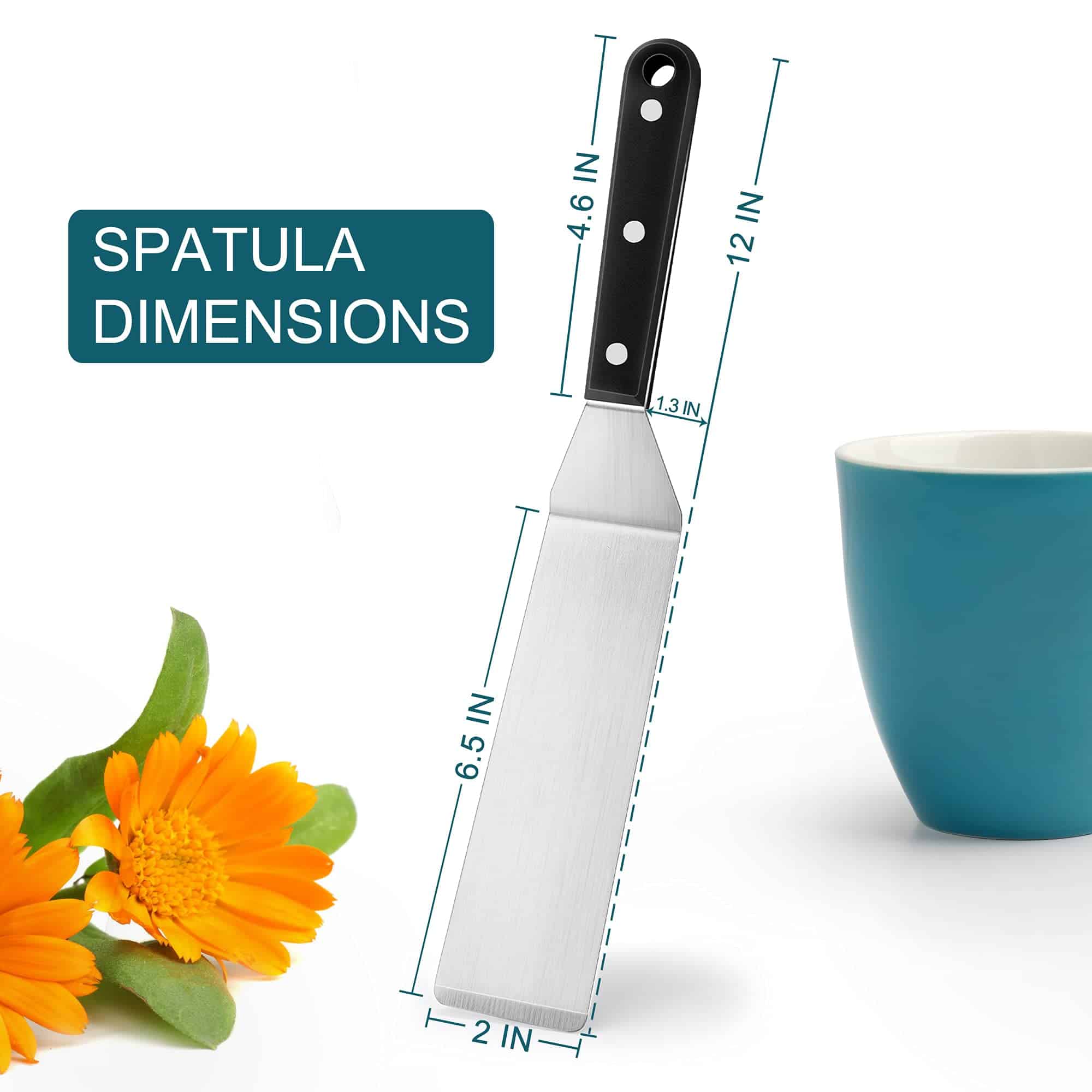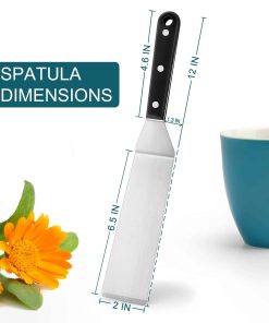 1. Espátula resistente, el grosor de la espátula de la parrilla es de hasta 1.5 mm, sólida para ofrecer un rendimiento estable, libre de doblarse o romperse, los mangos remachados triple son más robustos y seguros que los doble remachados de otros, el proceso de moldeado de una sola pieza garantiza la vida útil del producto, el acero inoxidable de alta calidad es anti-óxido y anti-impacto. 2. Ergonómica, el mango ergonómico se ajusta adecuadamente a la forma de tu mano para ofrecer un agarre cómodo, el borde biselado ayuda a voltear los alimentos de manera más eficiente y picar los alimentos directamente en la parrilla, el ángulo de 45 grados entre el mango y la hoja de metal te protege de las altas temperaturas, el mango de ABS es resistente al calor y antideslizante. 3. Apto para lavavajillas, el acabado mate suave facilita la limpieza, apto para lavavajillas para ahorrar trabajo, los ganchos colgantes adicionales son ideales para el almacenamiento, se recomienda colgar las espátulas con ganchos extra después de limpiar y secar para un mejor mantenimiento. 4. Multiusos, duradero para cocinar o hornear en familia, apto para cocinar y voltear salmón, camarones, hamburguesas, cubos de carne, salchichas bobo, verduras picadas, trabaja con este set en la cocina de casa, en el patio trasero, en un restaurante, también es ideal para ocasiones al aire libre como acampar, cocinar en plancha, asar a la parrilla.