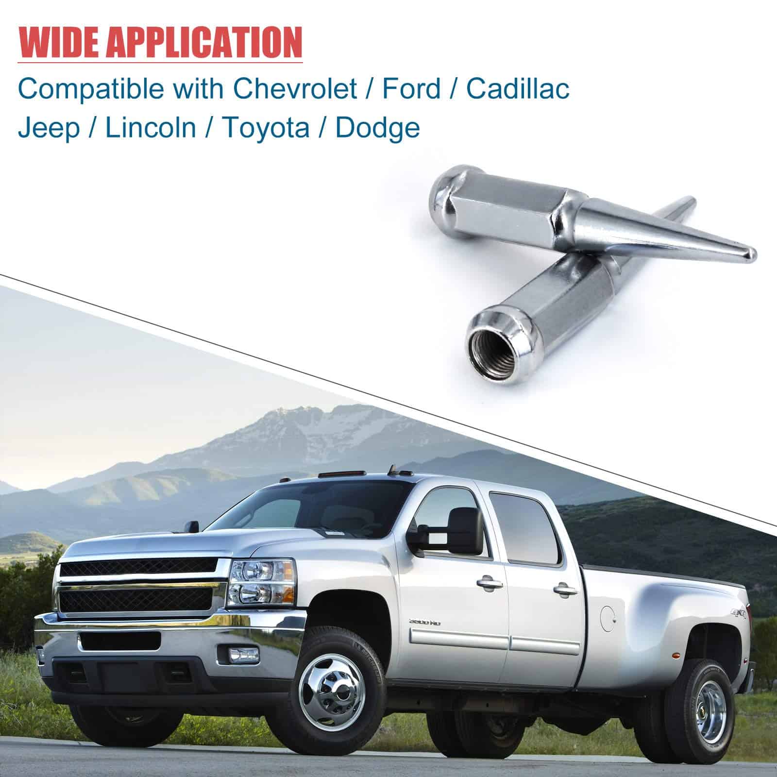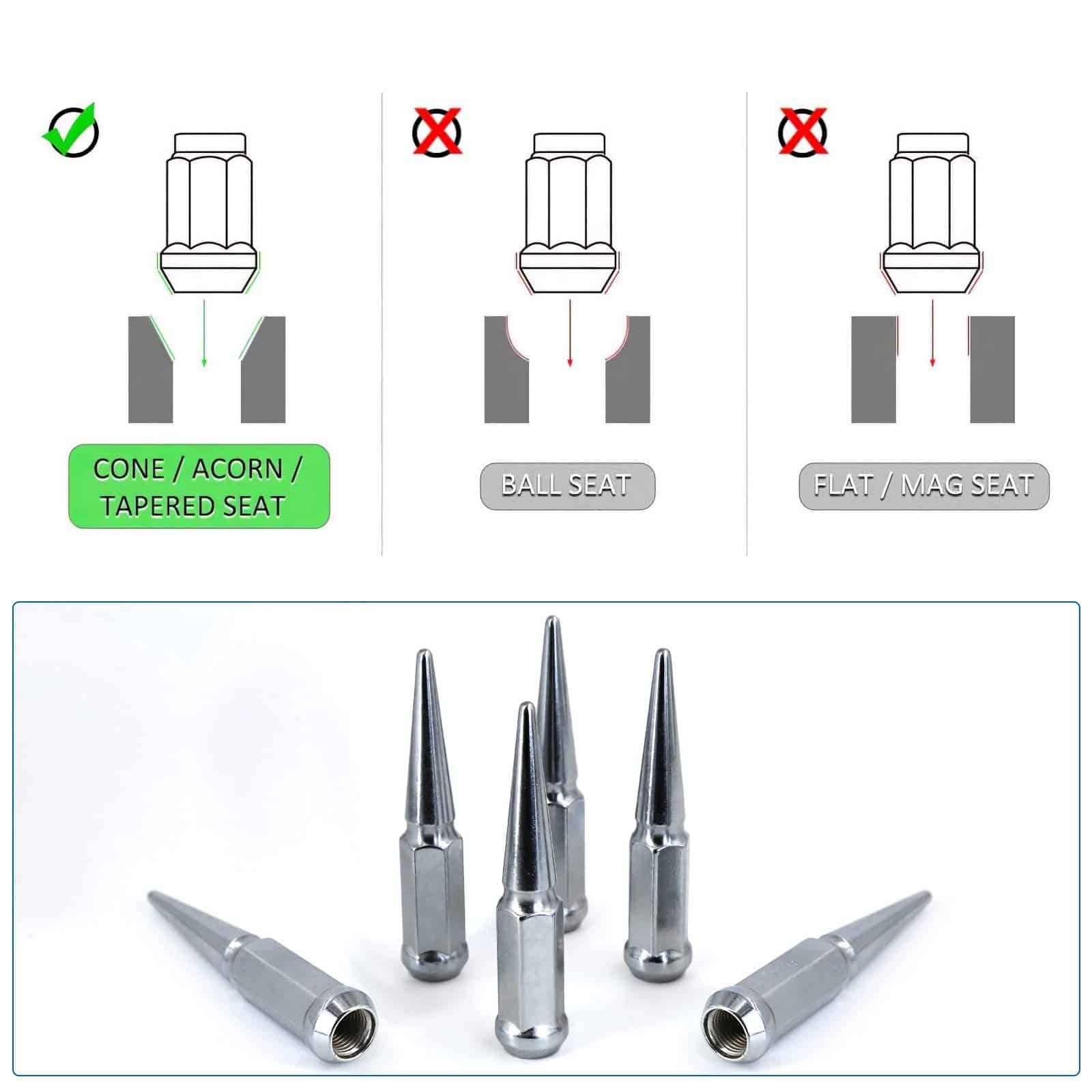 1. Tuercas de Rueda Puntas M14x1.5 AMPLIA APLICACIÓN Ruedas con un paso de rosca de 14 mm x 1.5 y asiento cónico de 60 grados (también conocido como asiento de cono), Compatible con GMC Sierra/Yukon/Savana, 1995-2017 Chevy Silverado/Suburban/Tahoe Express Avalanche/Cadillac Escalade de 6 tornillos, Ford F250 F350, 2011-2017 Grand Cherokee (SRT-8), 1998-2016 Land Cruiser, 2007-2017 Tundra Sequoia, 2012-2017 Ram 2500 3500.