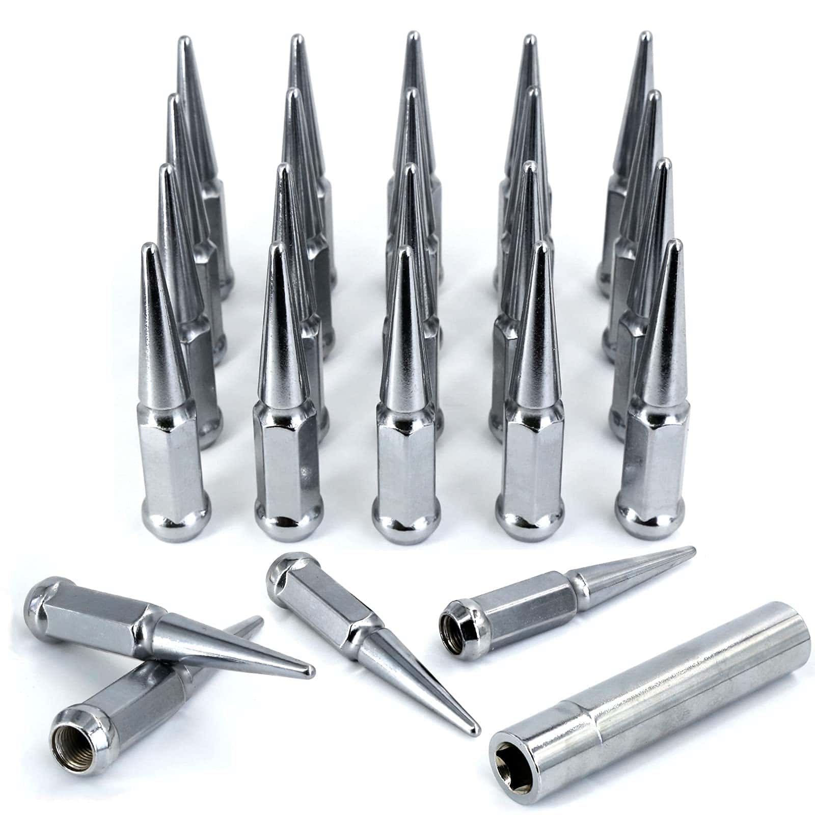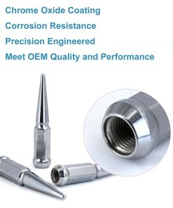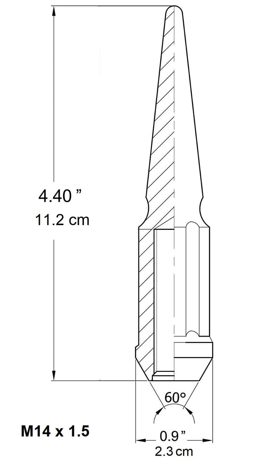 2. Tuercas de Rueda Puntas M14x1.5 ESPECIFICACIONES 24 x Tuercas de Puntas+ 1 Llave de Vaso. Tuercas de Acorn de Puntas Extendidas, paso de rosca M14 x 1.5 mm 14 mm x 1.5. Altura total 4.4″ (112 mm), Diámetro 0.9″ (23 mm). Extremo cerrado, asiento cónico de 60 grados, una Llave de Vaso de 3/4″ (19 mm) para instalación. Embalaje a prueba de golpes.