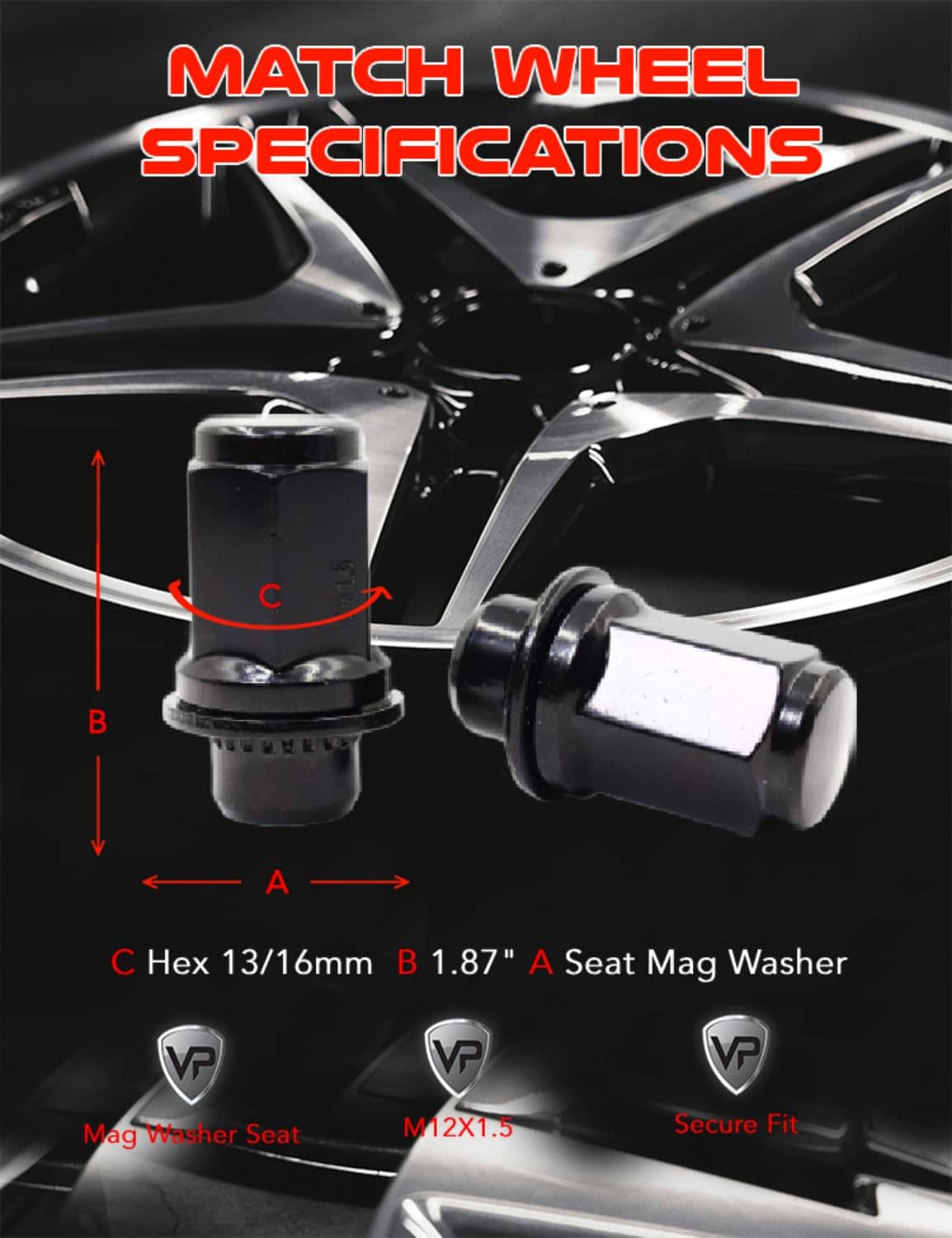Juego de 24 tuercas negras de estilo mag de fábrica OEM de Veritek. Estas tuercas están diseñadas para ajustarse perfectamente a tu Toyota Tacoma, 4 Runner, FJ Cruiser, SR5, Pre-Runner, TRD Off-Road o cualquier otro vehículo compatible. Con una rosca de 12×1.5mm y un hexágono de 13/16″ para un fácil ajuste, estas tuercas tienen una longitud total de 1.87 pulgadas. El acabado negro le da un aspecto elegante a tus ruedas, mientras que el material de acero de grado 10.9 tratado térmicamente garantiza resistencia y durabilidad. Estas tuercas están forjadas en frío para una mayor fortaleza, cumpliendo o superando los estándares de fábrica OEM. ¡Obtén la máxima seguridad y funcionalidad con este juego de tuercas negras de Veritek!