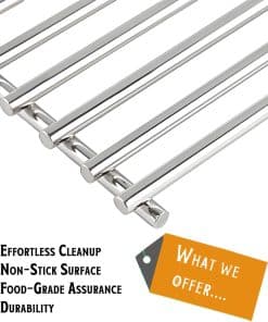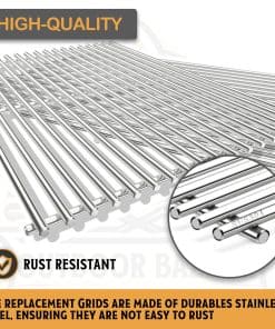 Si estás buscando una forma de mejorar tus modelos de parrilla de 4 quemadores de Backyard Grill, BHG, Uniflame, Revoace, Dyna-Glo y otros fabricantes, puede que quieras considerar nuestro juego de 3 rejillas y parrillas de acero inoxidable. Estas son rejillas de parrilla uniflame de alta calidad que se ajustarán perfectamente a tu parrilla y mejorarán tu experiencia culinaria. Aquí tienes algunas de las características y beneficios de nuestros productos: – Las rejillas de parrilla bhg están hechas de acero inoxidable duradero que es fácil de limpiar y mantener. Tienen una superficie antiadherente que evita que los alimentos se peguen y se quemen. También tienen un acabado liso y brillante que agrega un toque de elegancia a tu parrilla. – Nuestras rejillas de parrilla dyna-glo de acero inoxidable son no tóxicas y seguras para cocinar. No contienen productos químicos dañinos o sustancias que podrían afectar tu salud o el sabor de tu comida. Puedes disfrutar de tus platos a la parrilla sin preocupaciones. – Estas rejillas y parrillas de acero inoxidable para parrilla de patio son fáciles de instalar y reemplazar. No necesitas herramientas especiales ni habilidades para instalarlas en tu parrilla. Nuestro juego de 3 rejillas y parrillas de acero inoxidable para modelos de parrilla de 4 quemadores es la solución perfecta para tus necesidades de parrilla. Haz tu pedido hoy y disfruta de los beneficios de nuestras rejillas de parrilla de reemplazo de alta calidad para cocinar al aire libre. Información del producto: Incluye 3 rejillas y parrillas de parrilla de acero inoxidable. Dimensiones de la rejilla de parrilla: 16 3/8 pulgadas de largo x 9.5 pulgadas de ancho. Dimensiones totales de la rejilla de cocción: 16 3/8 pulgadas de largo x 28.5 pulgadas de ancho. Material de la rejilla de cocción: Acero inoxidable. Compatibilidad con rejillas y parrillas de parrilla: Reemplaza 55-24-326, 55-23-027, se ajusta a modelos de parrillas de gas de 4 quemadores similares de varios fabricantes. Antes de hacer un pedido, asegúrate de medir el tamaño de tu rejilla de parrilla de barbacoa de 4 quemadores original para asegurar un ajuste perfecto.