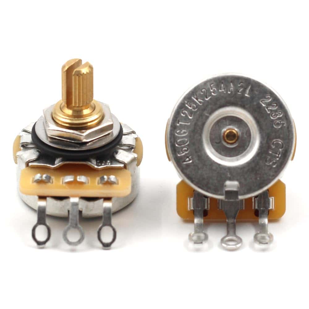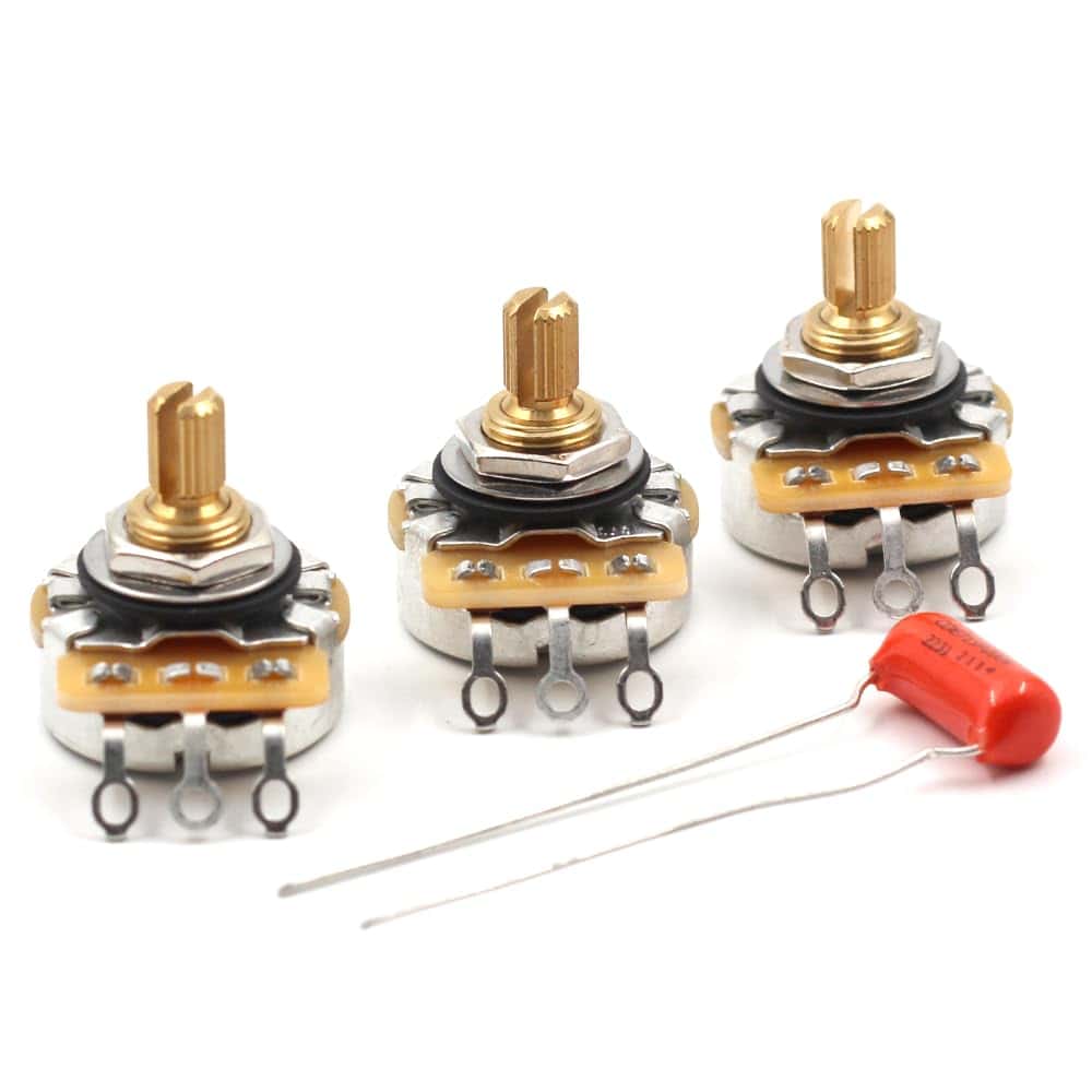 El set Art of Tone de 3X potenciómetros CTS 450G series 250K con estilo vintage y eje dividido. 1X capacitor Cornell-Dubulie Orange Drop .022uf/200v. La serie 450 está diseñada específicamente para uso en guitarra. Tolerancia del 10%. Incluye buje de latón de alta calidad y eje de latón. Cada potenciómetro viene con tuerca, arandela de bloqueo y arandela decorativa. Estos son potenciómetros de eje corto (el buje roscado mide 1/4″ de alto y 3/8″ de diámetro, el eje estriado fino de 24 dientes mide 1/4″ de diámetro). Potenciómetros fabricados por CTS para la marca The Art of Tone. Gran elección para Strats. Nota: Esta parte tiene el tamaño para guitarras hechas en Estados Unidos y requiere un agujero de montaje de 3/8″ de diámetro.