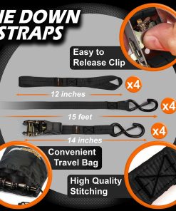 2. JUEGO DE 4 PARA VERSATILIDAD: Nuestras Correas de trinquete TitanPro vienen en un conveniente paquete de 4, brindándole todas las correas de amarre que necesita para diversas aplicaciones, ya sea para camiones, remolques, motocicletas o cuatrimotos.