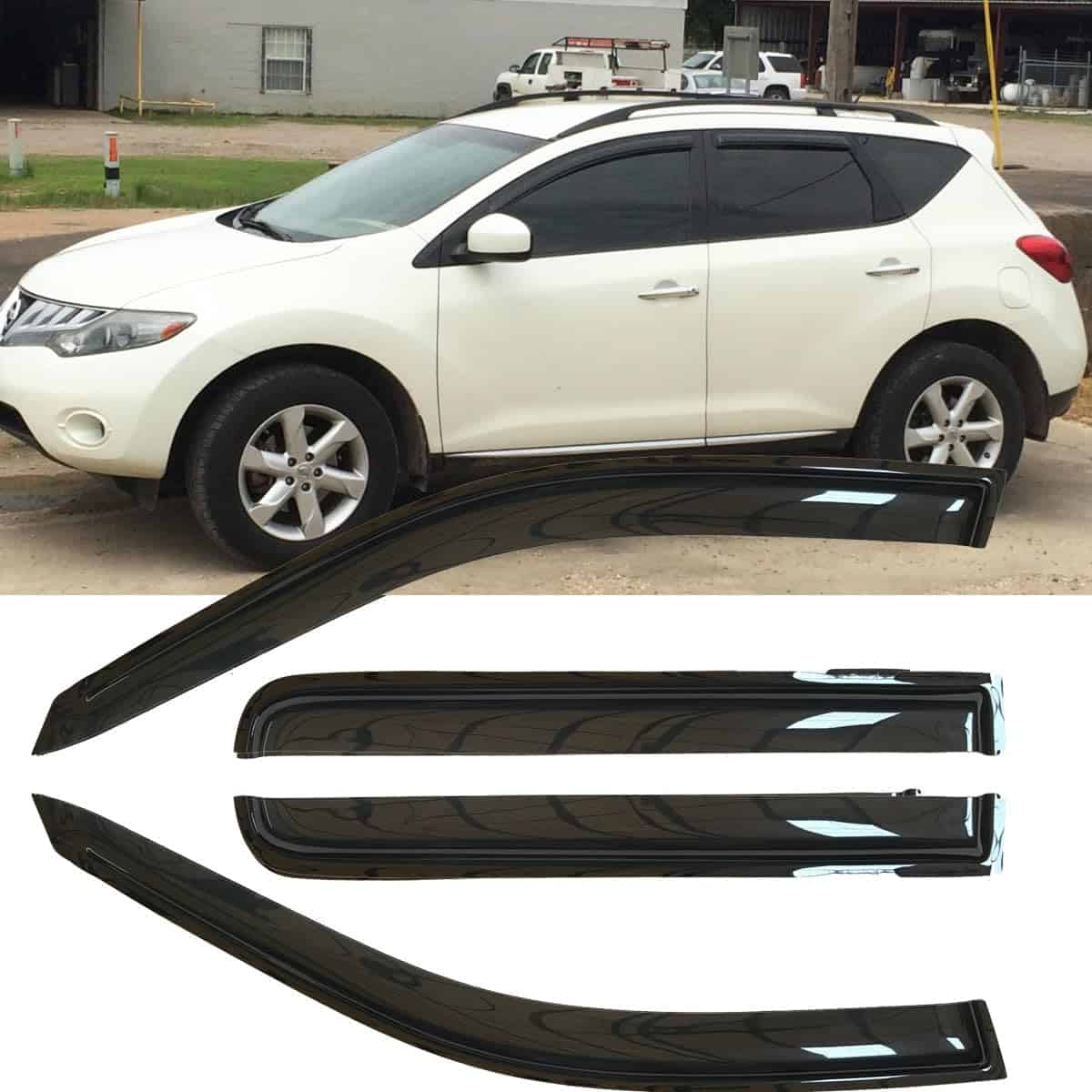 1. Ajuste: Deflectores de ventanas de lado de pasajero y conductor para Nissan Murano 2009-2014. 2. Paquete incluido: 4 piezas de viseras oscuras de sombra para ventanas (instrucciones de instalación incluidas, por favor lea las instrucciones de usuario antes de la instalación). 3. Duradero y agradable: Nuestro deflector de aire está hecho con acrílico reforzado de alta calidad resistente y irrompible, no se doblará, romperá ni agrietará. El diseño flexible y aerodinámico de color humo oscuro ha sido elegido óptimamente para protección solar, además de mejorar la apariencia de su precioso vehículo. 4. Haga que sus viajes sean agradables y seguros: Puede conducir con comodidad con nuestros guardabarros, sin preocuparse por el ruido del viento, la nieve fría, las molestas salpicaduras de lluvia o el sol abrasador. Ayuda a mejorar la ventilación para reducir la formación de vaho en las ventanas y mantener una vista clara para hacer los viajes seguros. 5. Fácil de instalar: Diseño directo de cinta adhesiva, fácil instalación de pegar y despegar y sin interferencias en el movimiento de las ventanas. Fácil de quitar sin afectar la apariencia de su auto (sin cortar ni perforar).