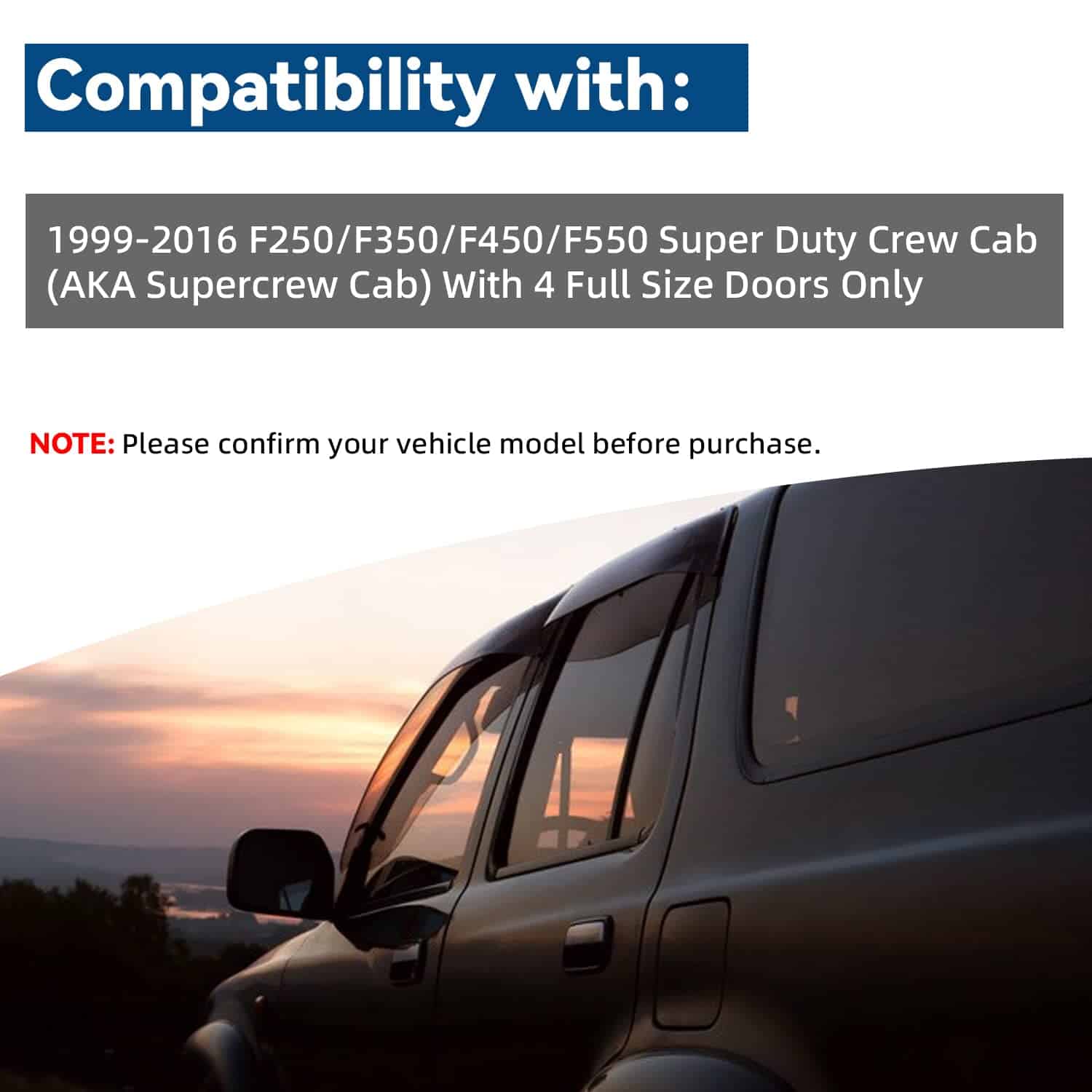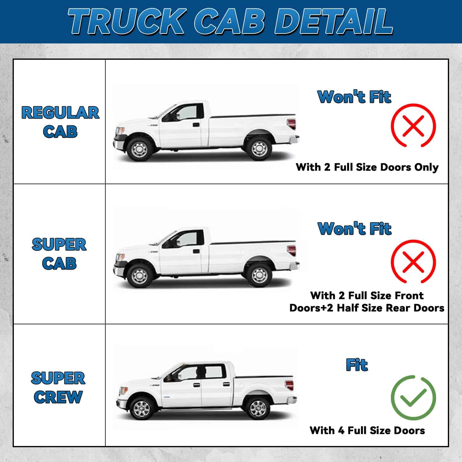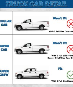 1. Ajuste: Ford F250/F350/F450/F550 Super Duty Crew Cab 1999-2016 (también conocida como Supercrew Cab) solo con 4 puertas de tamaño completo.