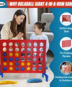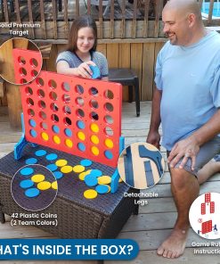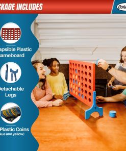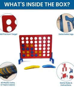 El Juego Gigante de 4 en Linea es la versión enorme del juego original de mesa pequeña para ¡Diversión Gigante! Este emocionante juego para 2 jugadores se puede jugar en interiores y exteriores. Su portabilidad y bolsa de viaje lo convierten en un gran juego para llevar de vacaciones, a fiestas, barbacoas, tailgating, reuniones familiares o incluso en tu propio patio trasero. Si el clima es malo, puedes llevar tu juego al interior y jugar en cualquier lugar y en cualquier momento. Adecuado para edades de 3 años en adelante. ADVERTENCIA: PELIGRO DE ASFIXIA – Piezas pequeñas. No apto para niños menores de 3 años.