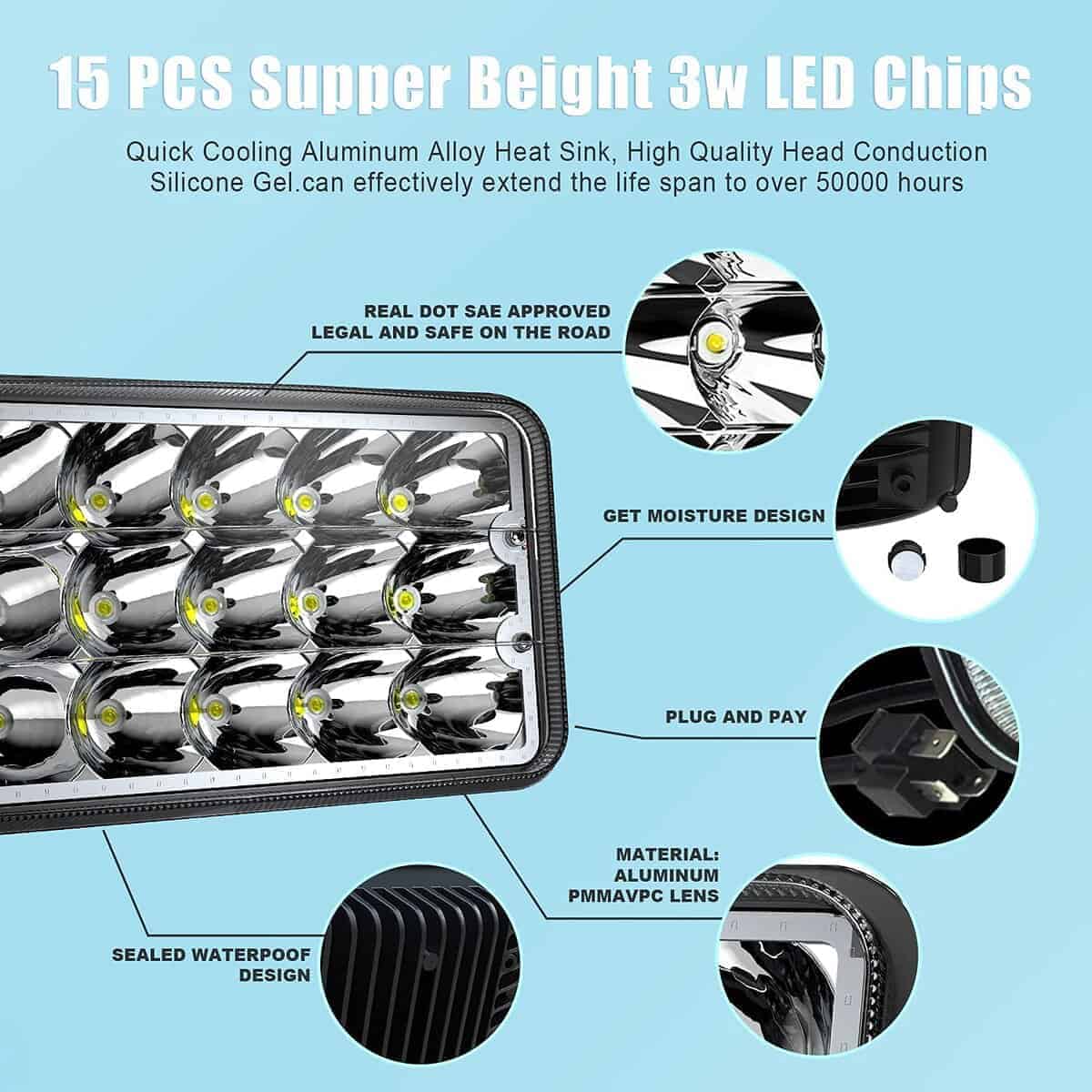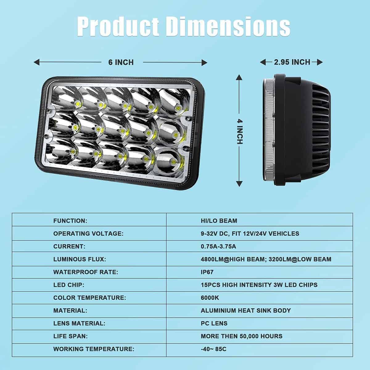 Nuestras luces LED selladas directas para vehículos con luces de 4×6 pulgadas están diseñadas para reemplazar cualquier luz de camión sellada por luces LED. Proporcionan más luz, luz más blanca y garantizan que no tenga que lidiar con luces quemadas para garantizar la seguridad del conductor (alta viga 4800 LM, baja viga 3200 LM). Confirme que esta parte es adecuada para su vehículo antes de comprar: H4656/H4651/4651/4652/H4652/H4666/H6545. También son adecuadas para la mayoría de otros vehículos, incluidos sedanes, SUVs ligeros y camiones, motocicletas, vehículos todo terreno y se adaptan a la mayoría de los vehículos clásicos desde tan temprano como 1955 hasta 1988: Dodge Challenger Charger Dart, Chevelle Corvette Nova, Ford Galáxia, Oldsmobile Cutlas, Pontiac GTO, Plymouth Barracuda, Road Runner. Nuestras luces LED selladas 4×6 avanzadas emiten luz blanca brillante y son claramente visibles. Las 15 copas de lámpara de alta viga están diseñadas especialmente para proporcionar un rango más amplio de iluminación, lo que le permite ver claramente los lados izquierdo y derecho. La luz del anillo Halo Azul como luz diurna es solo para uso off-road o de espectáculo. Nuestras luces LED selladas 4×6 tienen una tasa impermeable IP68, que sigue funcionando y es muy brillante después de estar en agua durante 2 horas y es efectivamente a prueba de polvo. El soporte de montaje de acero inoxidable protege contra el óxido y la corrosión. El enfriamiento rápido de las aletas de aleación de aluminio y el gel de sílice térmico de alta calidad pueden extender efectivamente la vida de la tira por más de 30,000 horas. ¡Por favor, revise el tamaño, tipo y forma de los productos en las imágenes para asegurarse de que sea el que necesita. Si tiene algún problema, tómese el tiempo para contactarnos, ¡estamos en servicio las 24 horas!